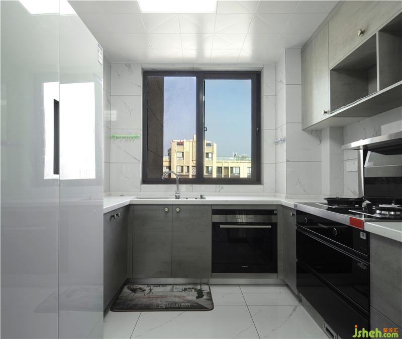 廚房水泥面的柜門(mén)配上白色的瓷磚,簡(jiǎn)約明亮,白色的大地磚鋪貼到墻上,方便擦拭油煙,地面也選用了同一款顏色,如果地面有臟,一眼就能看到,方便清掃。頂上也是選用了最簡(jiǎn)單的白色集成吊頂。廚房的總寬度2.6米,一邊0.6米寬的柜子,中間過(guò)道還有1.4米左右,很寬敞哦。