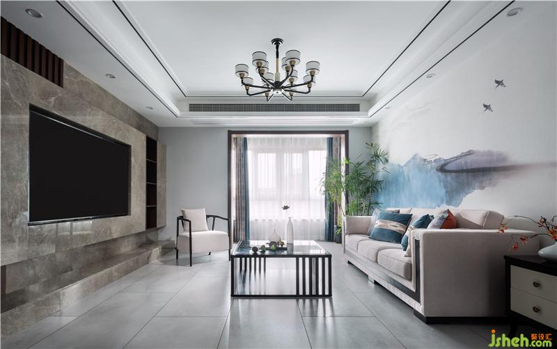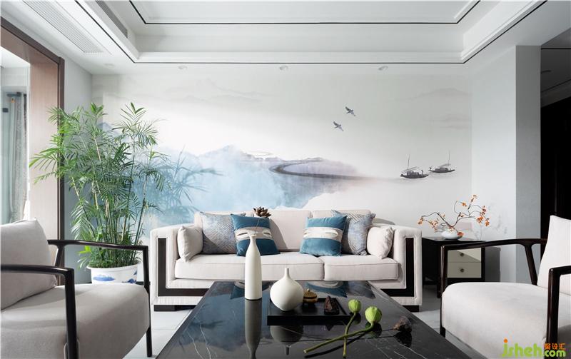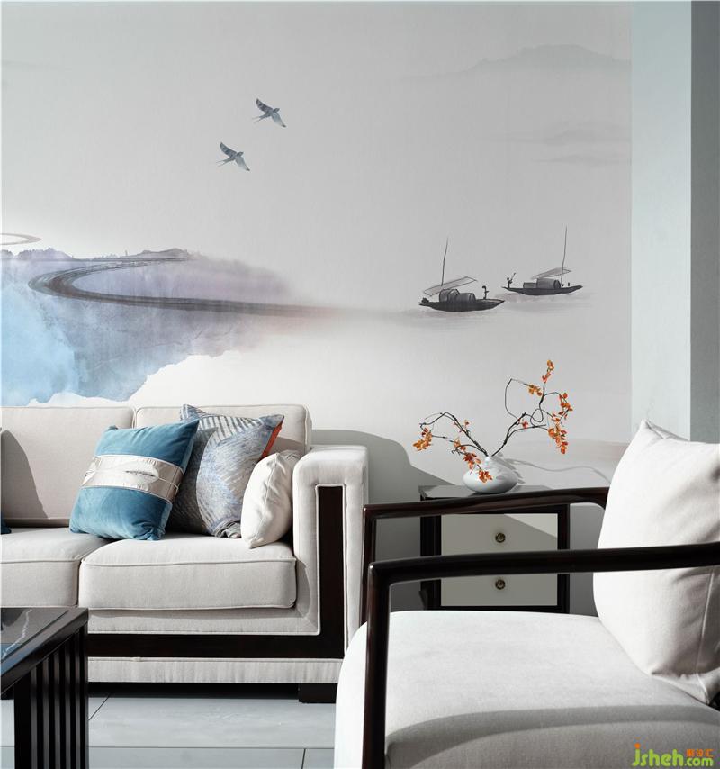 南京裝修設(shè)計(jì)客廳的水墨畫(huà)中,一葉扁舟浮于江水之中,水波輕輕蕩漾開(kāi)來(lái),墨燕飛過(guò)當(dāng)空,畫(huà)外一束枝條探出瓶外往畫(huà)中伸去,畫(huà)里畫(huà)外,不是一個(gè)世界卻相互交融。