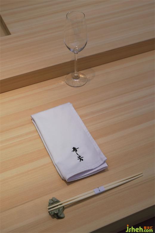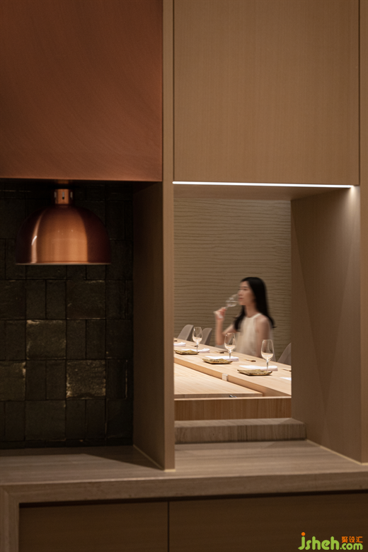 空間細(xì)節(jié)上的巧思妙想,遠(yuǎn)不僅于此。板前料理的壽司臺(tái)采用的一塊檜木,不經(jīng)打磨與拋光,以保留其天然的紋理、質(zhì)感和痕跡,日深月久,再以日本傳統(tǒng)的刨木工藝,將表面木層刨去,使之恢復(fù)干凈,宛如歲月的洗禮。