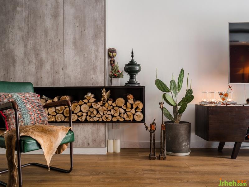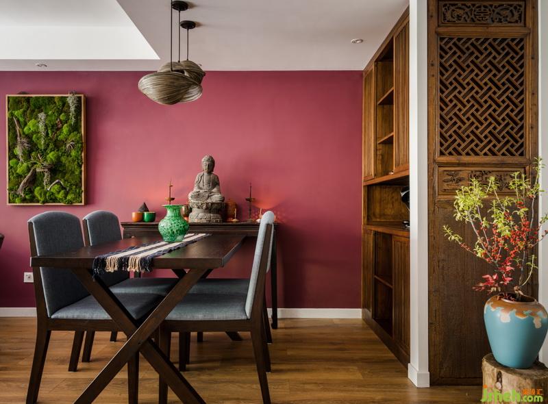 “這里是整個客廳最具中國風的地方,貝殼燈、佛像、燭臺、還有碧色花瓶等等都被集中在了這一處。”室內設計師邵介紹說。
