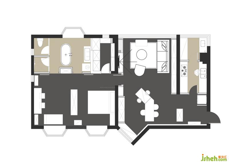 將三分式衛(wèi)生間置于臥室中,是整個設(shè)計的最大亮點。兩扇門可同時開啟分別進入洗手區(qū)和馬桶洗浴區(qū),浴缸俏皮的點綴在整個空間的聚焦之處,使得空間豐滿而又動線十足,與其說是三分式布局延展了空間的體量,倒不是說是浴缸的開放式擺放承載了整個衛(wèi)浴區(qū)的韻雅,彼此相輔相成加強了溝通,為居住提供了最能還原人性本質(zhì)的情感需求。