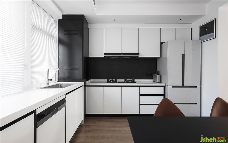 純白造型的定制櫥柜,黑色線條作為造型的一部分,完美的表達了現(xiàn)代風廚房的側重點,注重功能簡化裝飾,在空間區(qū)域的劃分上更加清晰??臻g寬闊而不狹窄,整體風格和整個家和諧的融為一體。