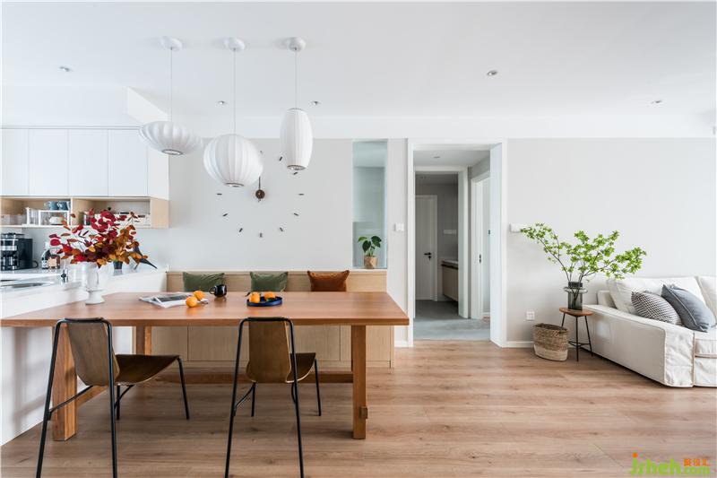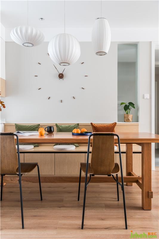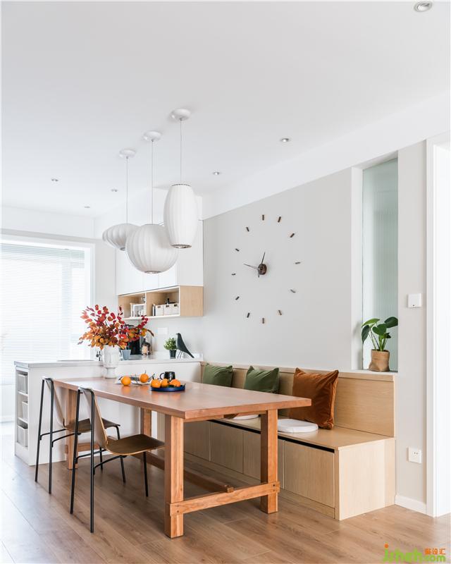 原來餐區(qū)有一個小陽臺,那個位置門被拆除了,餐廳和中廚的空間變得更大。櫥柜結(jié)合島臺設(shè)計解決了這里餐區(qū)空間的收納問題,純白的櫥柜結(jié)合木地板給人一種干凈舒服的感覺,家具色彩越是柔和視覺攻擊力就越低,越能給人一種放松下來的居家氛圍。