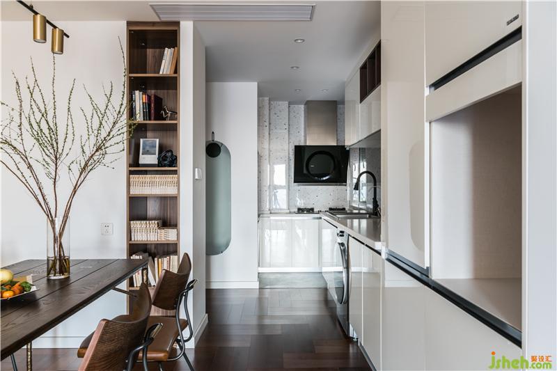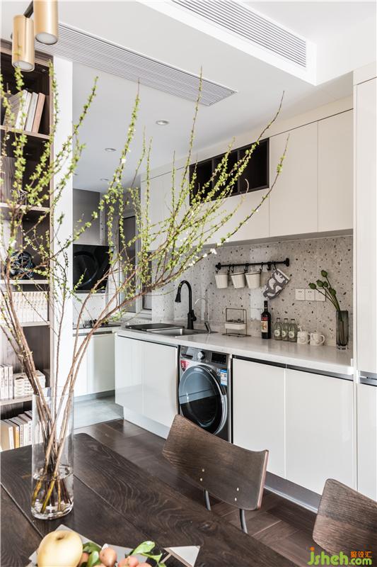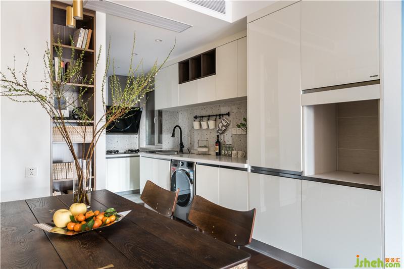 廚房設(shè)計(jì)中臺面和柜體全部使用了白色,這樣做的原因一是做到很好的反光效果,增加空間采光,面板的材質(zhì)采用烤漆板,質(zhì)感不錯的同時耐磨耐用。西廚水槽旁邊設(shè)計(jì)了三排插座,解決廚房電器的電源需求,而洗碗機(jī)和洗衣機(jī)都做了嵌入式設(shè)計(jì),放進(jìn)西廚下方的柜子里,節(jié)省空間使用便捷。