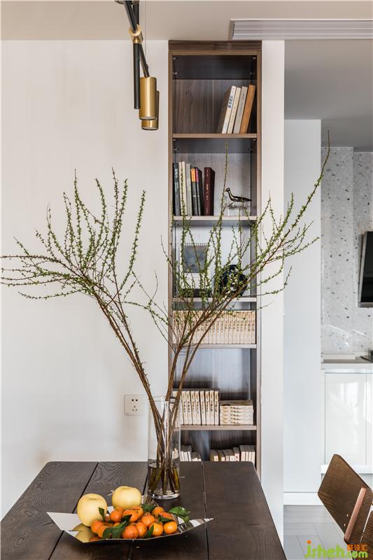 廚房、餐廳全開放式空間,整個空間以干凈的白色和純粹的材質(zhì)打造,沉淀感的木質(zhì)作為點(diǎn)綴穿插其中,北歐風(fēng)格卻使用簡約的元素,廚房墻面采用烤漆柜體和水磨石墻磚相結(jié)合,材質(zhì)碰撞但和諧,餐廳區(qū)域是書柜展示架結(jié)合木餐桌的設(shè)計(jì),金屬吊燈和餐廳的拼色墻主色調(diào)進(jìn)行了呼應(yīng)。