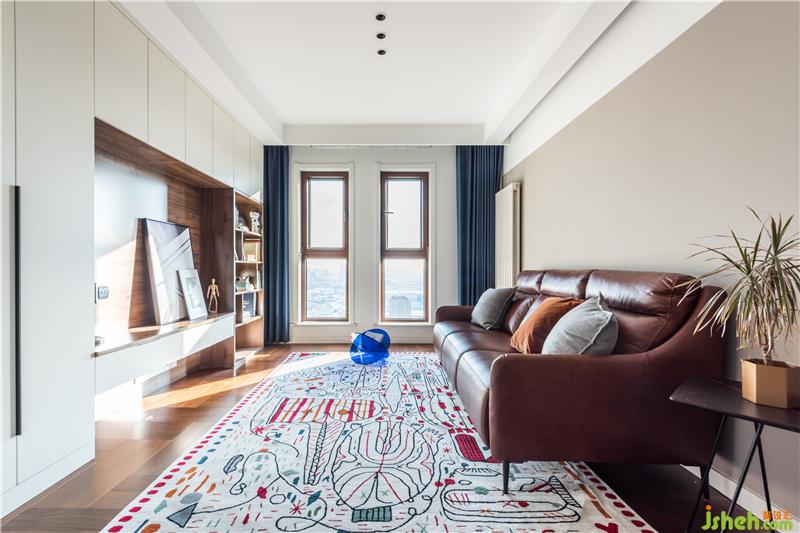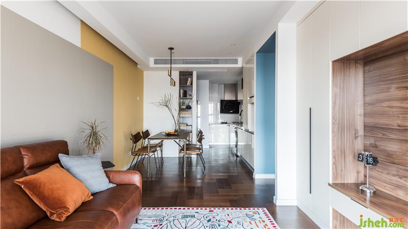 設(shè)計(jì)之初還有一個有趣的故事,我們的艷青設(shè)計(jì)師在了解過業(yè)主夫婦的習(xí)慣和職業(yè)后,在設(shè)計(jì)方案的配色上主動的選用了比較冷靜,純粹的顏色,以此契合業(yè)主的職業(yè),但后來在第二次接觸中發(fā)現(xiàn)我們的業(yè)主對色彩的接受度是很高的,所以愉快的溝通之后,能發(fā)現(xiàn)這個家的確是色彩滿滿,清新俏皮的餐廳拼色墻,客廳沙發(fā)是飽滿的亮橙色以及抽象畫地毯,主臥的墻面和洗手間也是不單調(diào)的顏色,用色彩來減壓的家居設(shè)計(jì)法,大家也可以Get這一招~