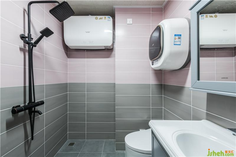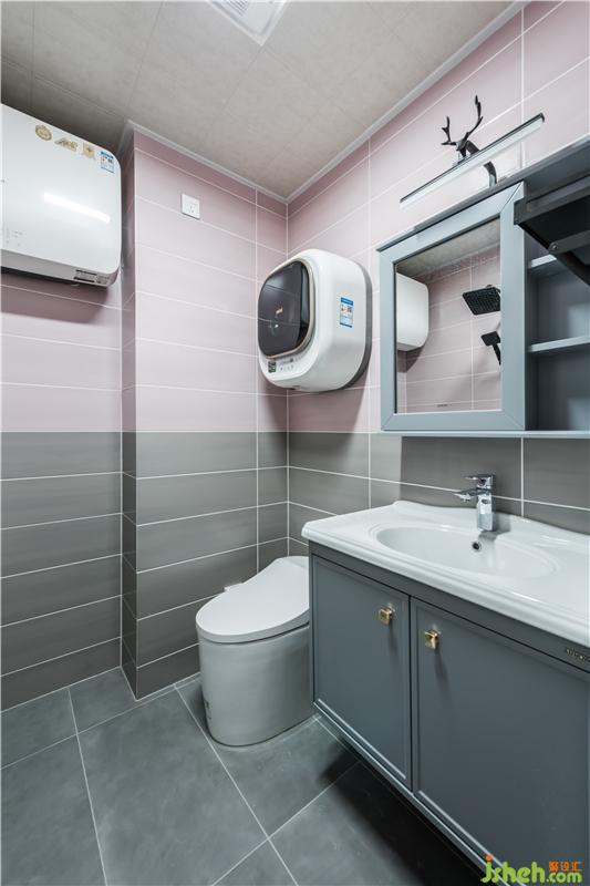 特別的茱萸粉色墻面搭配灰色地磚,同是低飽和度的顏色讓整個空間顯得優(yōu)雅低調,濕區(qū)和干區(qū)也做了分離式設計,洗手盆用鏡柜和地柜的結合解決物品收納的需求,手盆旁邊是坐便,規(guī)劃合理方便使用。