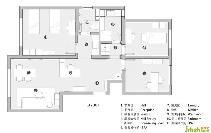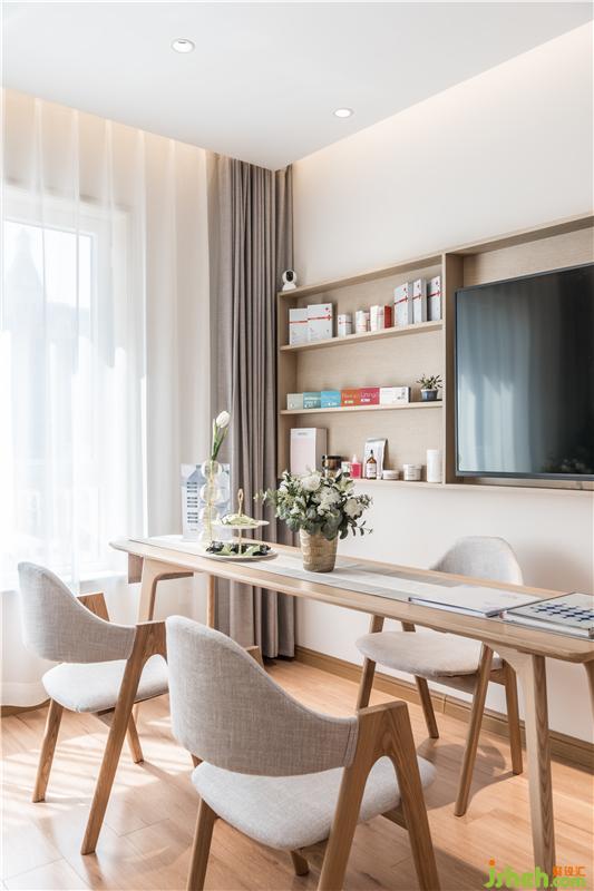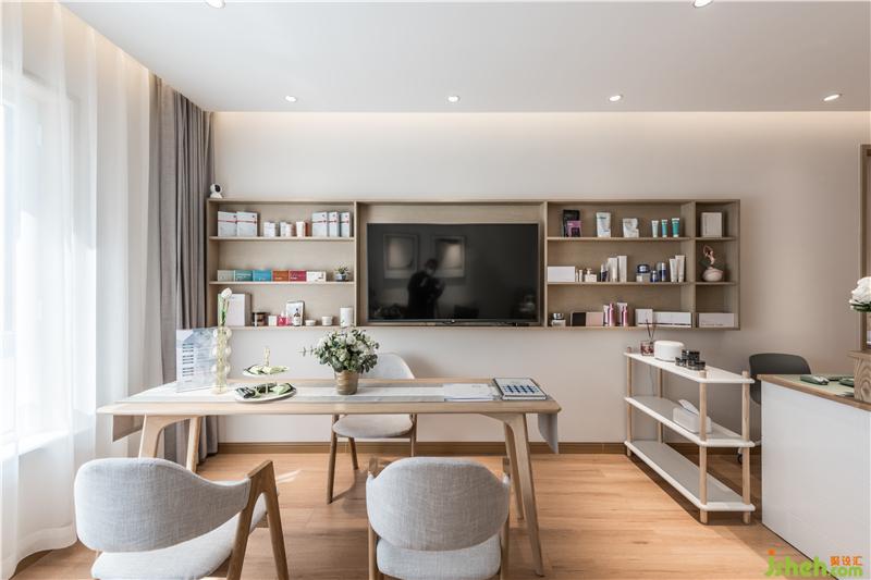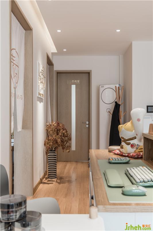 白色屬于純粹到極致的顏色,將干凈柔和包裹在這個空間里。流暢開闊的空間里,緩緩打開一個屬于純粹、自然的空間。這個空間的“自然,素雅”,如女性內(nèi)心里的世界一般,安靜,流動變化,細膩豐富。以日系庭院作為設(shè)計靈感的“青石美容沙龍”,青石兩字的涵義來自:日本庭院枯山水的概念,以石比喻山巒,以白沙比喻湖海,在這里靜止的永恒美,和對美的想象共存。