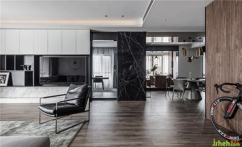 入戶將天然黑色大理石板作為空間背景,線條生動(dòng)色彩跳脫的裝飾畫和沙發(fā)椅作為視覺焦點(diǎn),材質(zhì)和顏色的對比突出整個(gè)空間沉淀的氣質(zhì)和高級質(zhì)感,同時(shí)也兼顧功能化設(shè)計(jì),右手邊的卡座方便坐下來更衣?lián)Q鞋。從玄關(guān)開始,我們通過有質(zhì)感的材質(zhì)和色彩單品打造整個(gè)空間的情緒,平靜中帶有的灑脫,利落,更加上自然光線的自如利用,大面積的深色顯得毫不灰暗,而是一個(gè)充滿質(zhì)感和享受的沉靜空間。