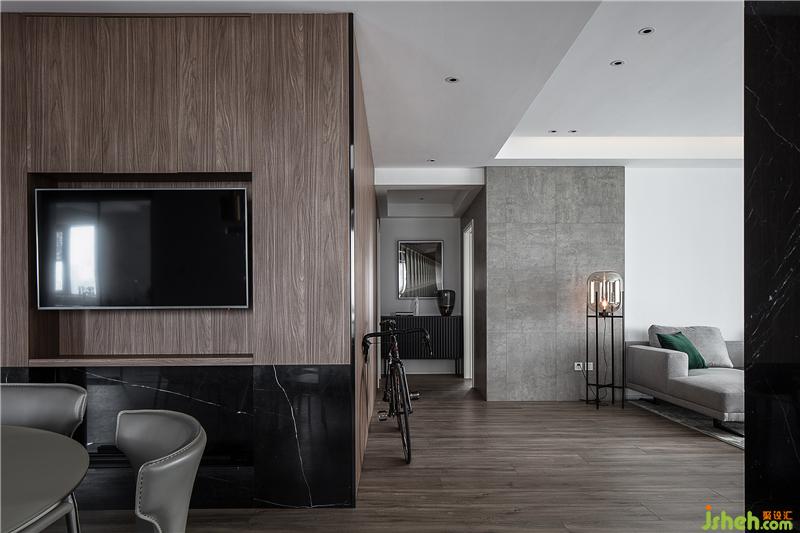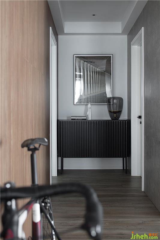 客廳的走廊和餐廳連接,大面積深色木飾面在這里的使用,和灰色水泥肌理墻板顯得十分和諧,柔和了這里區(qū)域空間的轉(zhuǎn)換,寬闊的走廊充分引入自然光線于室內(nèi),視覺也隨走廊而延伸,走廊盡頭的展示柜和藝術(shù)掛畫,造成空間連續(xù)的視覺感知,有主有次的空間遞進(jìn)。