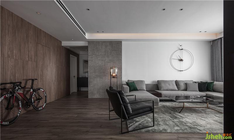 灰色調(diào)+木色的客廳區(qū) 地毯和沙發(fā)組合帶來安靜而沉穩(wěn)的感受