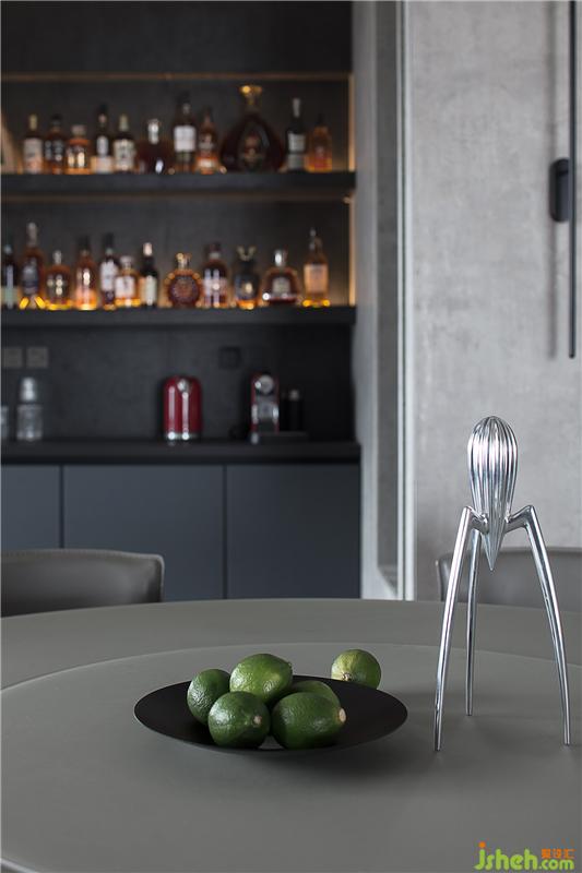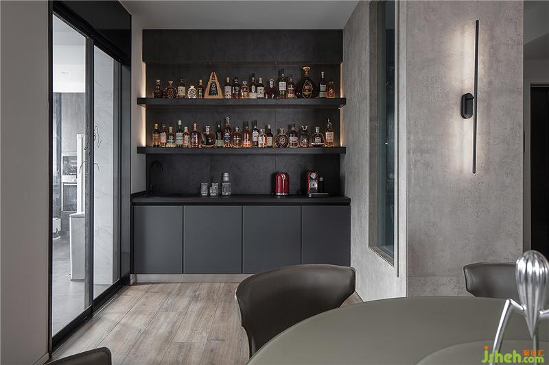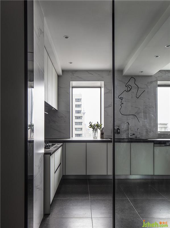 整個(gè)空間被全部打開,以灰、白、黑色為主調(diào),墻面和柜體由白色色塊組成,加上纖細(xì)的線條,滿足廚房的烹飪需求和收納需求后,又在材質(zhì)上形成統(tǒng)一,洗碗機(jī)、蒸烤箱按照尺寸都嵌入櫥柜里,關(guān)上門都被隱藏起來,除了玻璃移門,其余墻都做了整墻櫥柜,結(jié)合大理石紋理的墻磚,廚房全部的收納都集中在這里,大大增強(qiáng)了空間儲(chǔ)物功能和便利性。男主人因?yàn)楹M饬魧W(xué)多年的經(jīng)歷,擅長烹飪,這里自然成為了他閑暇之余大展身手的地方。
