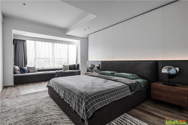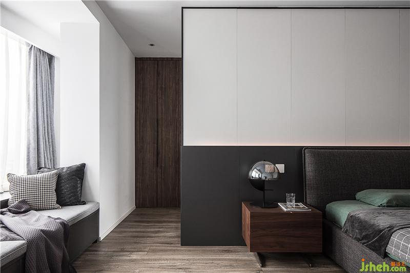 主臥的飄窗是改造后的陽臺(tái),納入室內(nèi)后整個(gè)空間十分寬敞,主臥背景墻是采用定制墻板,純白的部分結(jié)合隱藏?zé)魩?,顯得十分有層次,深色系的床品和地毯結(jié)合白色的頂面框架,帶來視覺上的和諧美感。這里的主臥并不是封閉的一覽無余的,背景墻左邊是留出了一個(gè)進(jìn)入衣帽間和主衛(wèi)的門。在不經(jīng)意處,暗藏玄機(jī)。