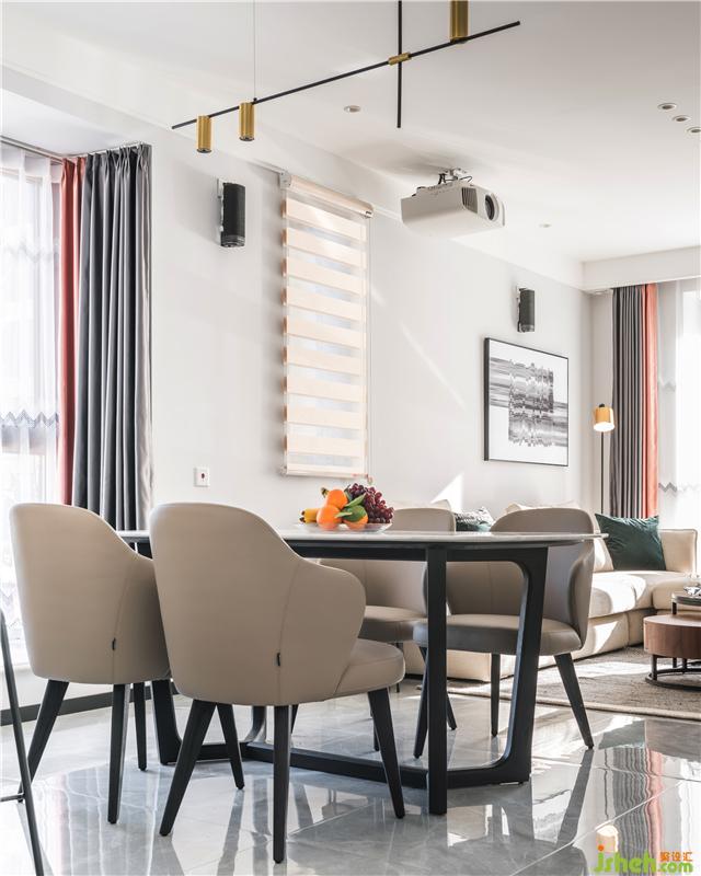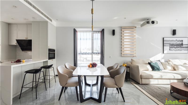 利用無墻體阻攔,空間開闊明亮的布局,把餐廳放在了休閑區(qū)和廚房的中間,這也是常使用的動線安排手法,好用方便,令人舒適的點是借助落地窗戶,餐桌在這里正對著窗外的景色,有著對稱的外景,陽光微風(fēng)里,在這里用餐的心情可以非常愉悅。