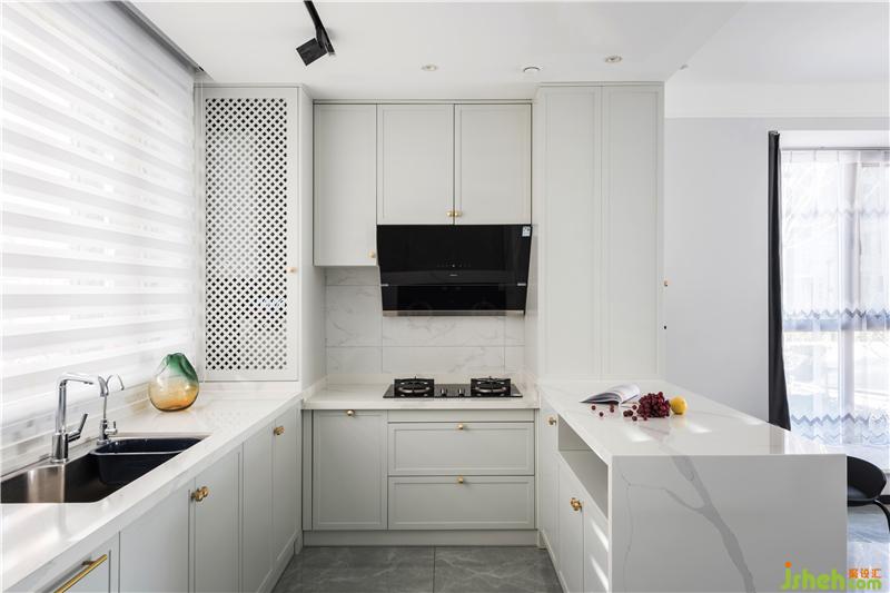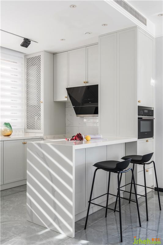 廚房結(jié)合吧臺的設(shè)計,滿足業(yè)主的多種需求,吧臺可以用作水吧區(qū),也可以作為早點和甜品的操作臺,柔和的質(zhì)感結(jié)合精致的櫥柜線條,無主燈的設(shè)計使整個空間實現(xiàn)重點照明和分散式照明,嵌入式的設(shè)計讓廚房空間連為一體,啞光白色的柜體結(jié)合灰色瓷磚使空間更通透,也更加舒適自然。