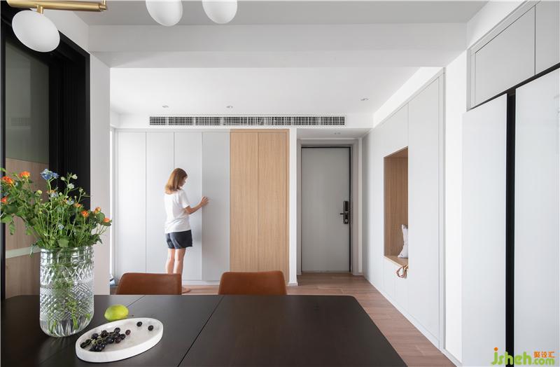 入戶是利用有限空間,塑造頂天立地的兩面收納墻,與整個(gè)空間渾然一體。不爭(zhēng)不搶沒(méi)有存在感,卻最大化的實(shí)現(xiàn)了廣闊收納空間,柜門開合之間,也留足了流暢的活動(dòng)空間,木色與淺灰,材質(zhì)和顏色突出整個(gè)空間沉淀安靜的氣質(zhì)。