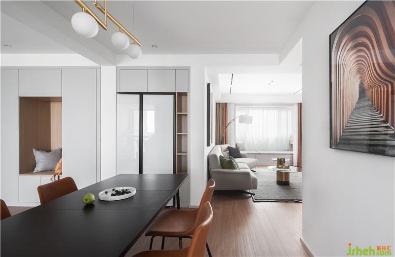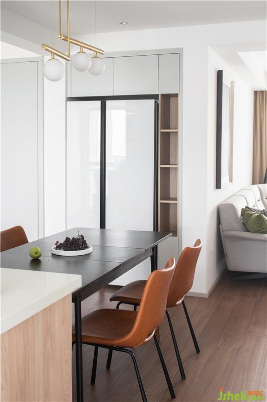 改變?cè)疾蛷d位置,將餐桌橫置,將入戶與餐區(qū)形成了流暢的過(guò)渡。同時(shí)廚房采用三聯(lián)活動(dòng)門,全部打開時(shí)餐區(qū)與廚房又有一個(gè)更親密的聯(lián)通。