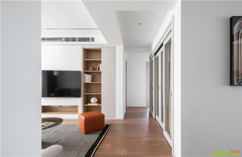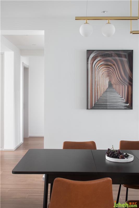 一個(gè)聯(lián)通的走廊,流暢串聯(lián)起來(lái)餐廚空間與客廳空間,使這里的空間感深邃。純白的射燈 頂面與女兒房的聯(lián)動(dòng)門,豎線條也有如此美麗的體塊韻律。