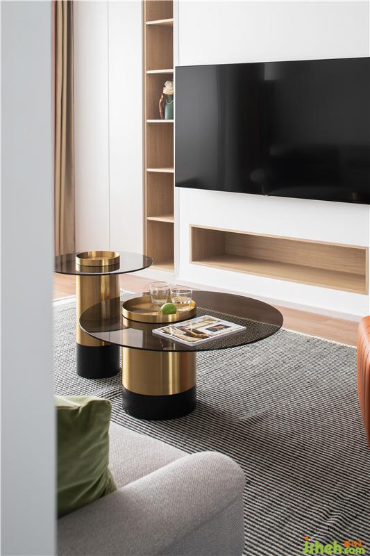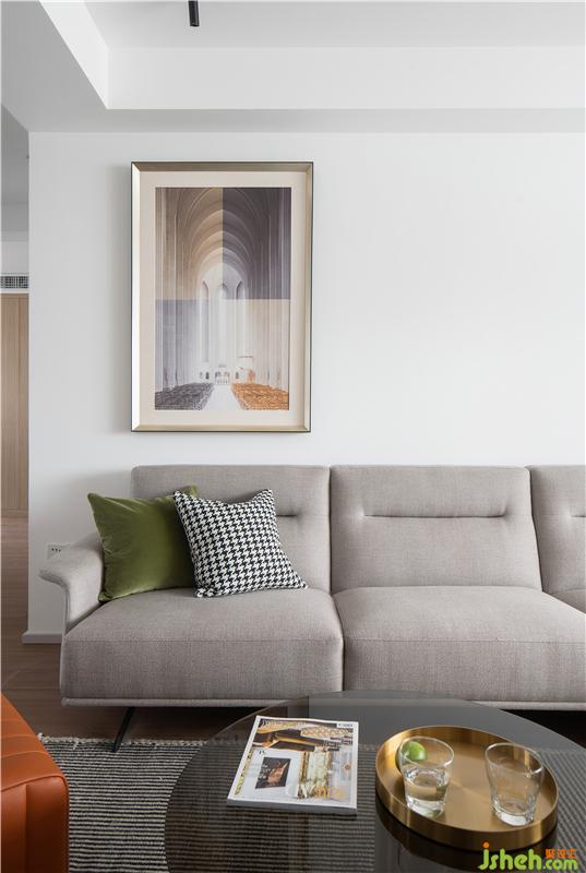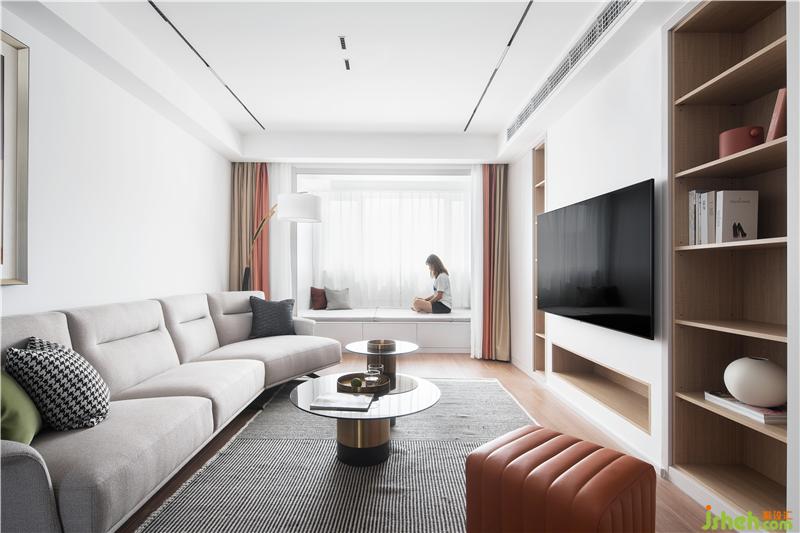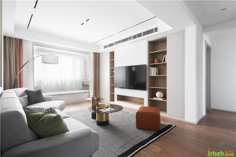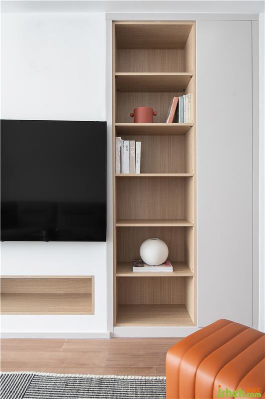 客廳,具有體塊化的空間卻擁有清爽宜人的配色,舒適的羊毛地毯給這里添了一絲懶洋洋的柔和。一個(gè)完全開敞的簡(jiǎn)約空間,純白與木質(zhì)讓這里具有令人一下子沉靜下來(lái)的魅力。繼續(xù)沿用墻面收納墻與開放書架結(jié)合,讓收納這件事?lián)碛谢麨榱恪⒎氯魺o(wú)物的功能。