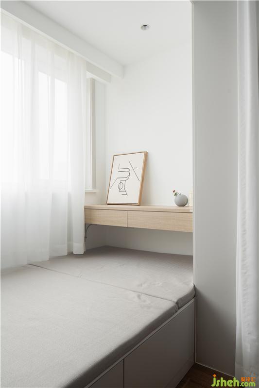 擴(kuò)大所有可利用的空間,原本的陽(yáng)臺(tái)被納入客廳變成一個(gè)擁有陽(yáng)光與微風(fēng)的榻榻米,原木懸空柜子是一個(gè)實(shí)用細(xì)節(jié),解決了更多喝茶、讀書、儲(chǔ)物的需求。拉上右側(cè)的掛簾,這里也能作為半開放的客臥使用,功能滿滿。——這是這個(gè)家的第二重「折疊」