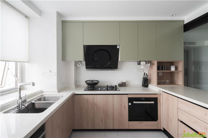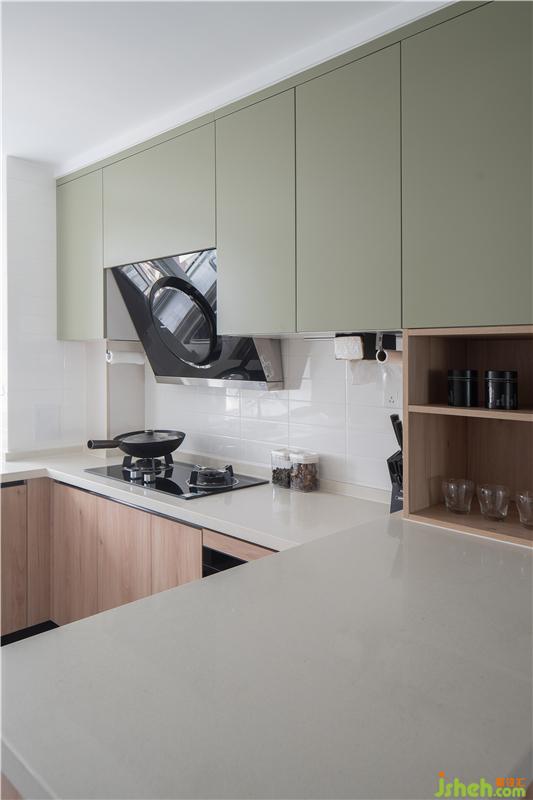 打開廚房的聯(lián)動(dòng)門,撲面而來(lái)是抹茶綠的清新,U型櫥柜布局在有限空間里實(shí)現(xiàn)了更多的操作空間。設(shè)計(jì)師選用原木與抹茶綠的色調(diào),帶來(lái)屬于森林的密語(yǔ),在這個(gè)空間,烹飪頓時(shí)變成了一個(gè)愉悅享受的過程。