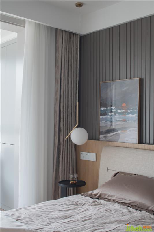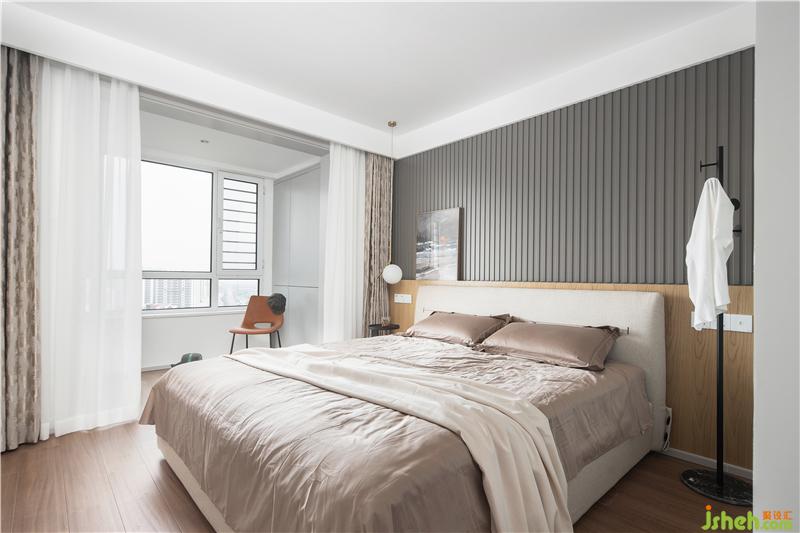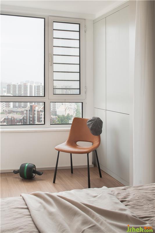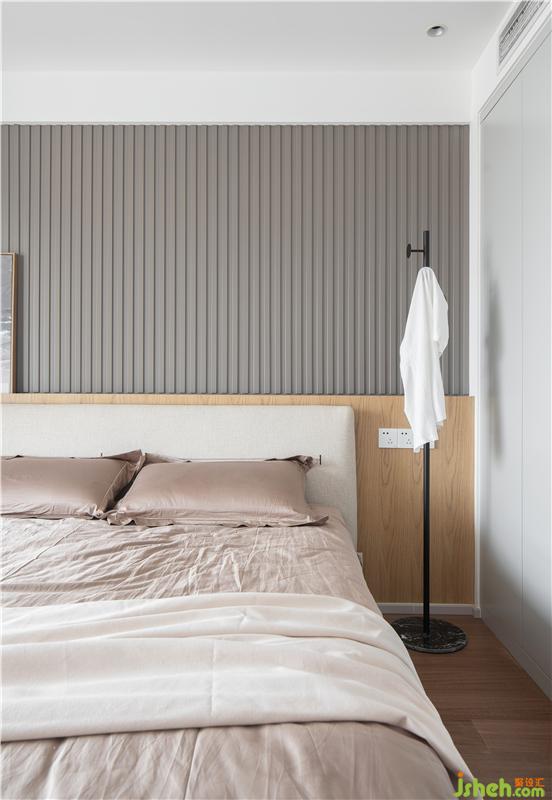主臥也做出了“斷舍離”的極佳收納模板,回歸最本質(zhì)的需求—舒適睡眠,其他交給最簡(jiǎn)約的形式來實(shí)現(xiàn)。靠墻近乎隱形的收納柜,保證入住后也能整潔如新,裸露的衣架和金屬邊幾,平淡中也有日常實(shí)用的細(xì)節(jié)。