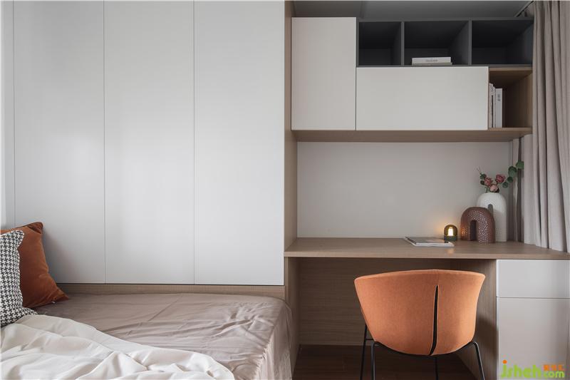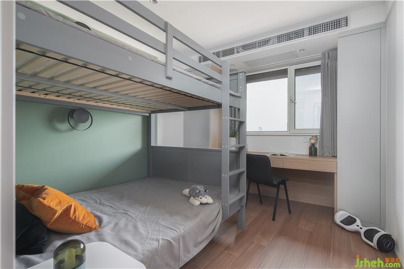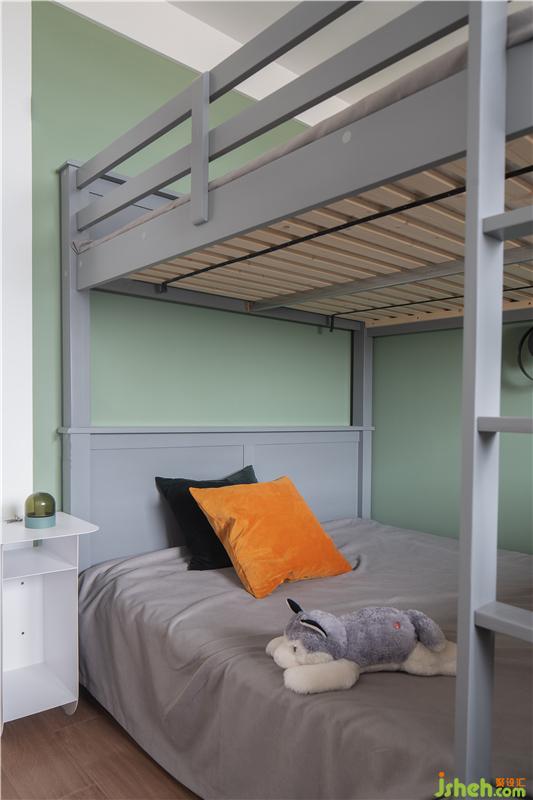 作為實(shí)現(xiàn)兩個(gè)人居住的次臥,上下床不失為一個(gè)穩(wěn)重的選擇。有限的空間里,通過巧妙布局,還能梳理出來一個(gè)供學(xué)習(xí)閱讀的書桌。兩面涂刷的復(fù)古綠背景墻,讓次臥擁有一些放松舒適氛圍。