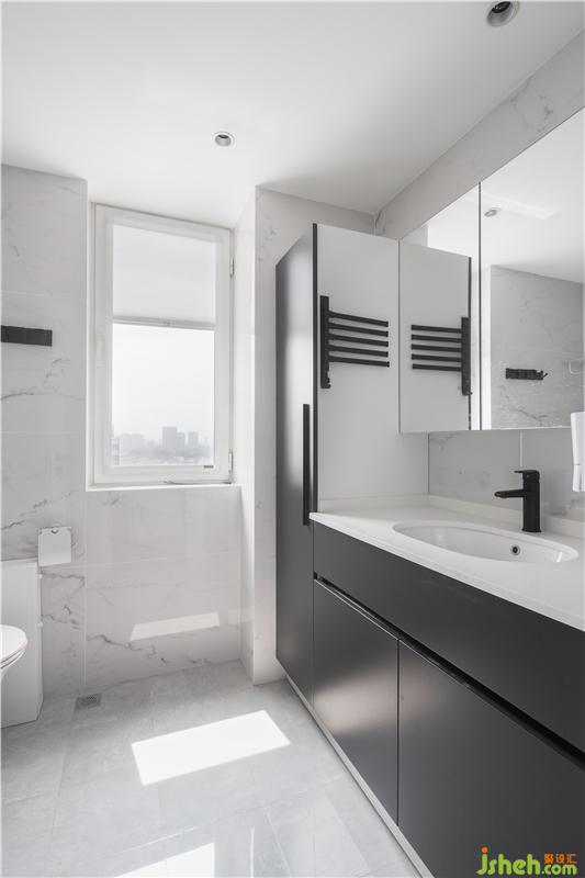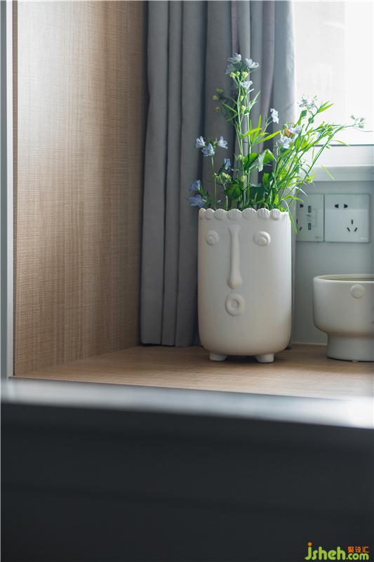 女兒房是與客廳聯(lián)通,用一個(gè)聯(lián)通門與深色掛簾實(shí)現(xiàn)了私密空間與公共空間的明確分隔。組合式的白色柜體與書桌,滿足功能的同時(shí)也顯得如此干凈、簡(jiǎn)潔。