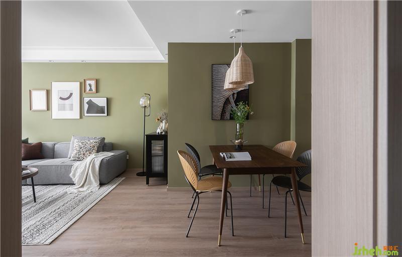 原本一覽無(wú)余的空間,左邊是玄關(guān)換鞋區(qū),右邊安排了一組藤編吊燈+餐桌餐椅,視角有了和緩的阻隔,同時(shí)餐區(qū)-客廳-廚房的這一組動(dòng)線更加流暢方便。