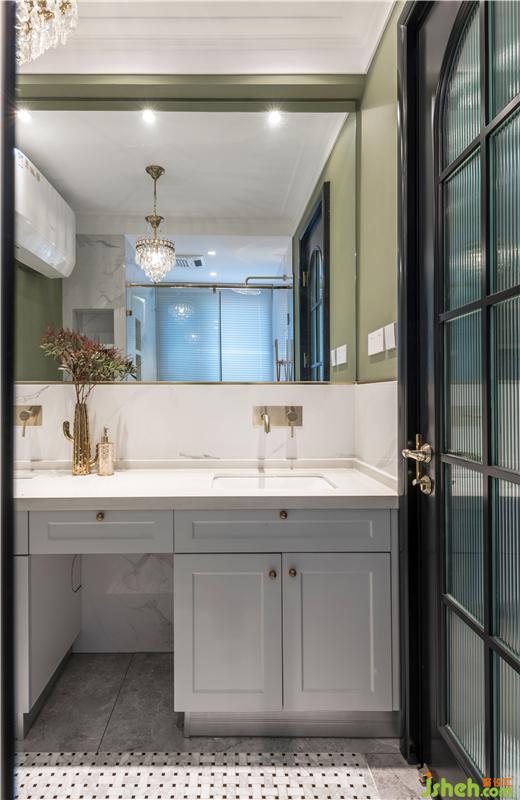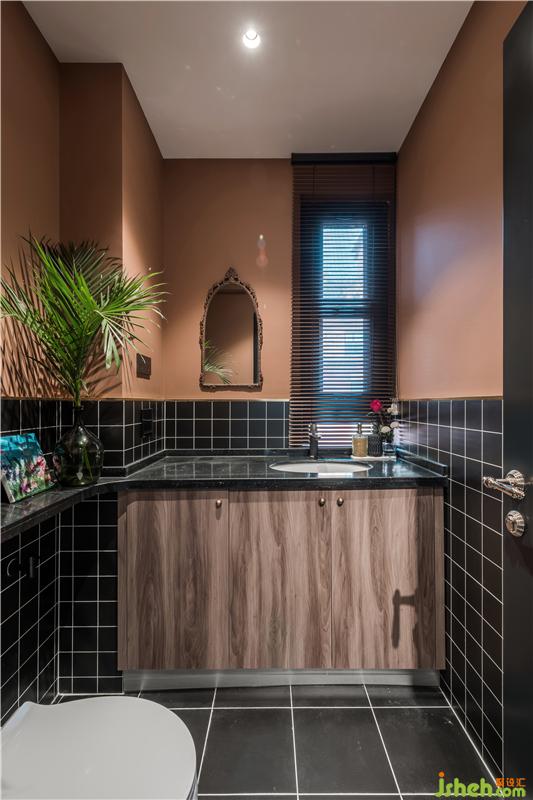 洗手間是一個比較私密的空間,天津別墅設(shè)計除了考慮風格,我們更多的想要達到一種空間氛圍,安靜,古典,所以選用了小黑磚搭配復古橘色,這是一個很妙的顏色,復古又有趣。