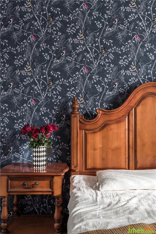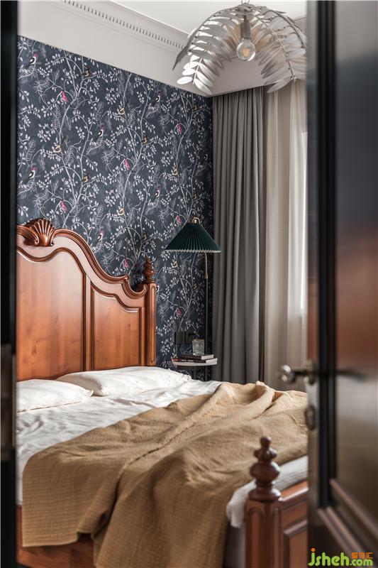 主臥最亮眼的顏色是背景墻,使用定制壁畫,深藍色的枝葉與數(shù)只小鳥,活潑優(yōu)雅,紋理質(zhì)感極好。與主臥的床搭配,天津別墅設(shè)計屬于復古的調(diào)性優(yōu)雅蔓延。主臥的收納都隱蔽在沒拍到的另一面收納墻里。