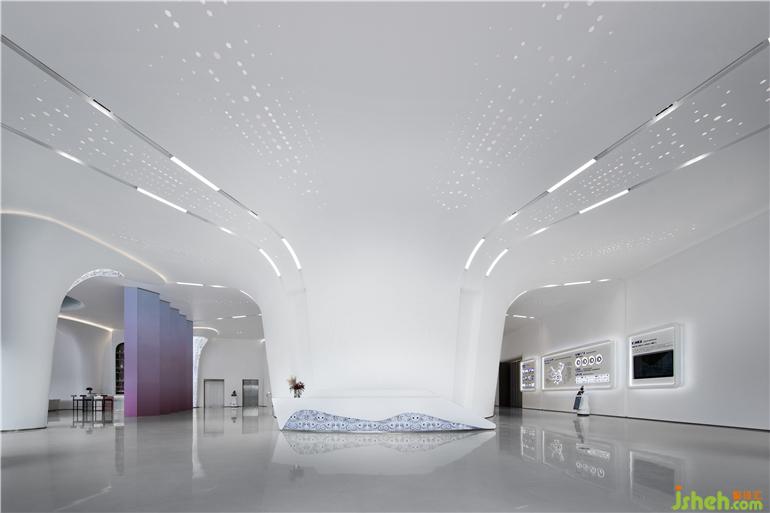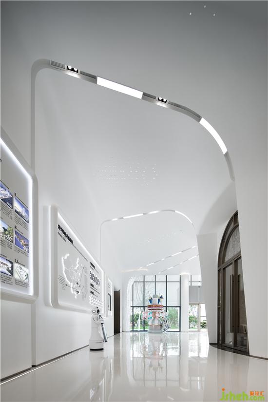 前臺接待區(qū)域,建筑層高為8米多,藝術中心設計團隊運用新材料將極富動感及現代氣息的設計風格融入藝術中心前廳中,室內設計上結合偉岸的建筑骨架,運用一氣呵成的手法,讓天花和立面進行無縫連接,在立面和天花局部細節(jié)的處理方面,在簡約的整體氛圍中設計團隊運用幾何光感形成如北斗般的陣列圖騰手法作為點綴,為行進之人指明方向,與空間空曠的體量呼應,形成空間開場獨有的儀式感。