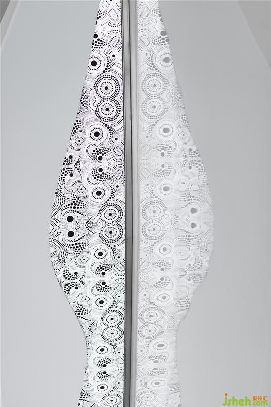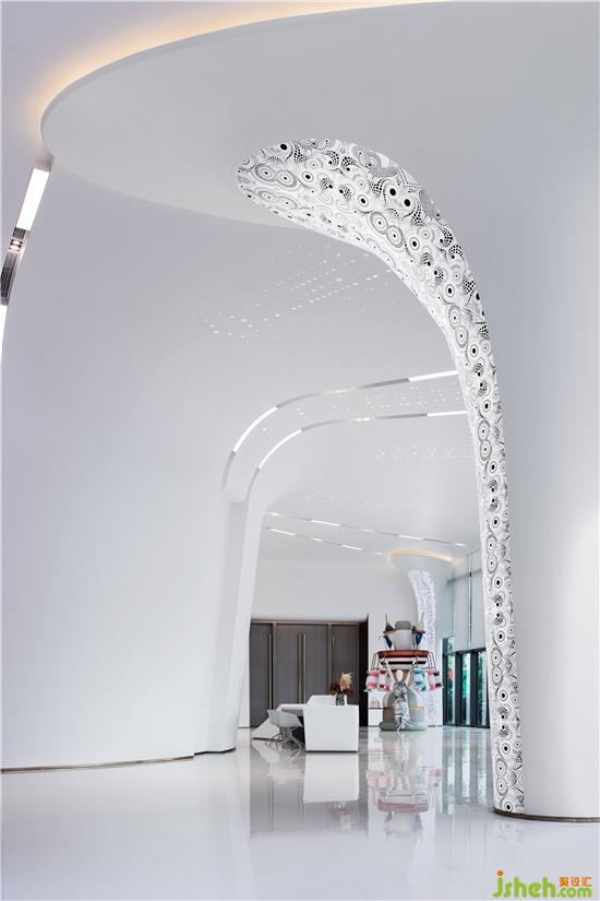 接待臺的處理形式上靈感來源于服裝中黑白波點的原素材形成的蕾絲圖騰,拉開整個空間創(chuàng)作主元素的序幕及其它空間的延伸想象,主入口右邊的裝置藝術,設計團隊運用了櫥窗展示的手法,加入色彩繽紛、漸變、精致、優(yōu)雅的形式作為點睛之筆。