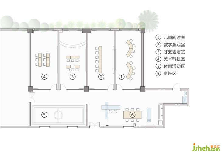 活動(dòng)室是教學(xué)、活動(dòng)表演、休息娛樂一體的,因此它的設(shè)計(jì)豐富多樣。
