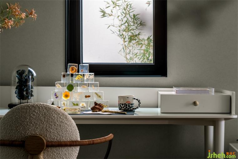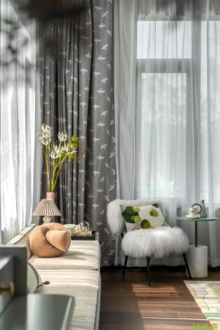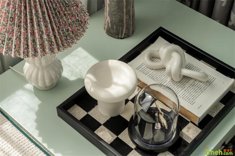 如同這個(gè)年紀(jì)的女孩一般,盛堂的設(shè)計(jì)手法除卻清朗還多了不少的巧思:她崇尚為美和自然的象征——蝴蝶,草木的標(biāo)本、毛茸茸、軟糯糯的抱枕、可愛靈動(dòng)的瓷偶、毫不喧賓奪主的碎花燈罩。