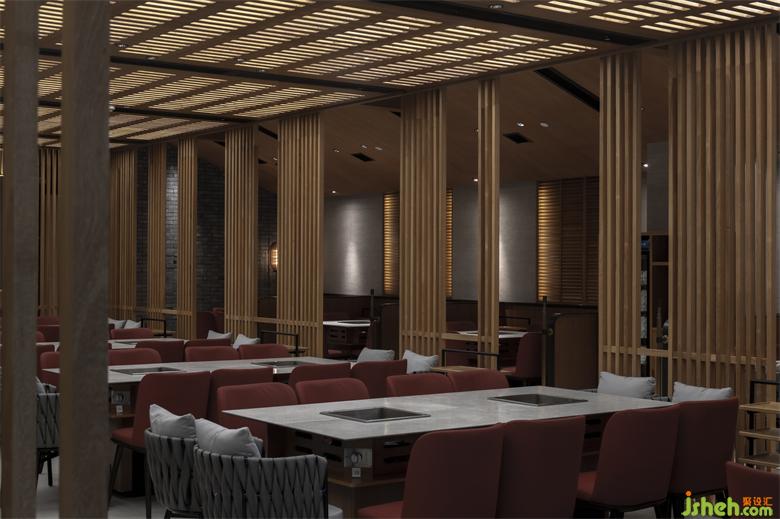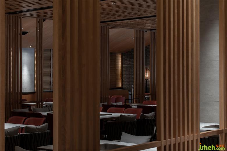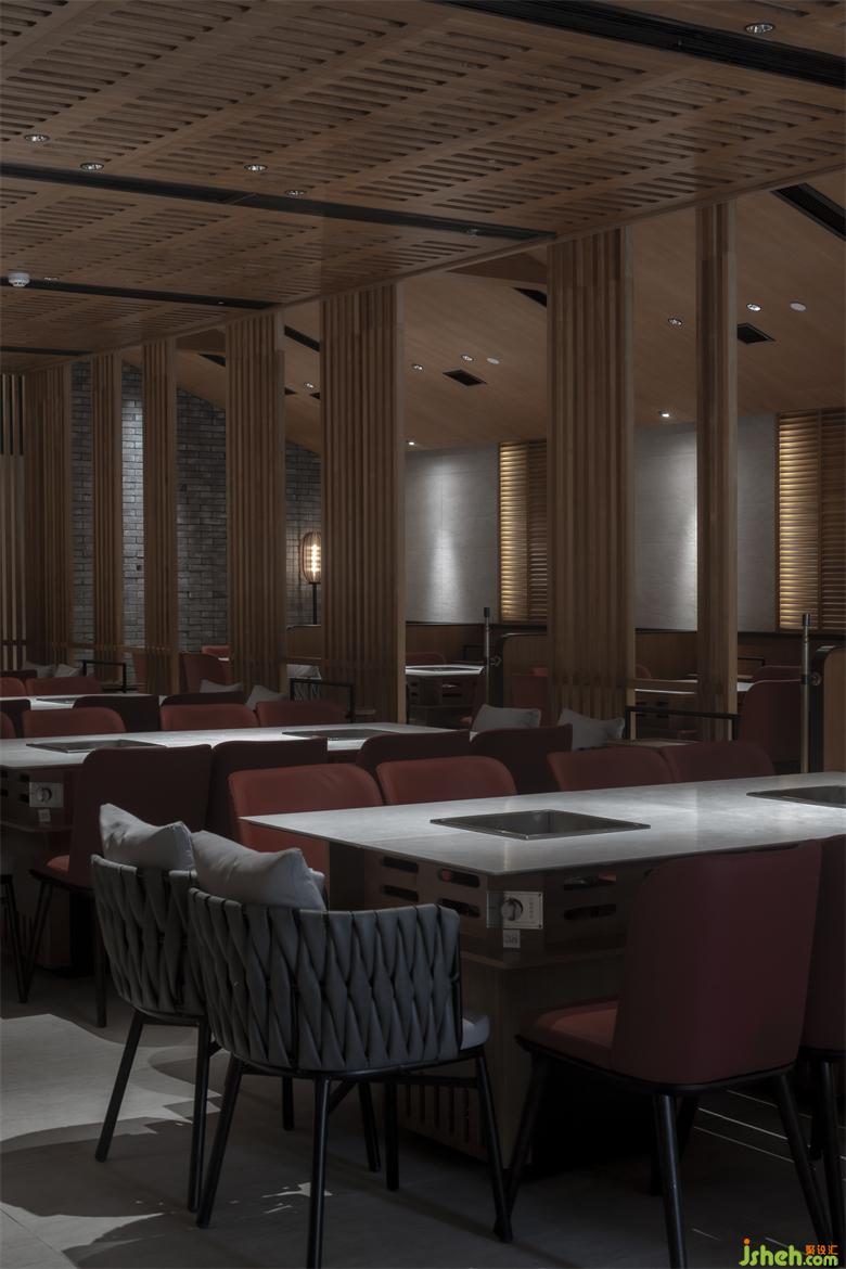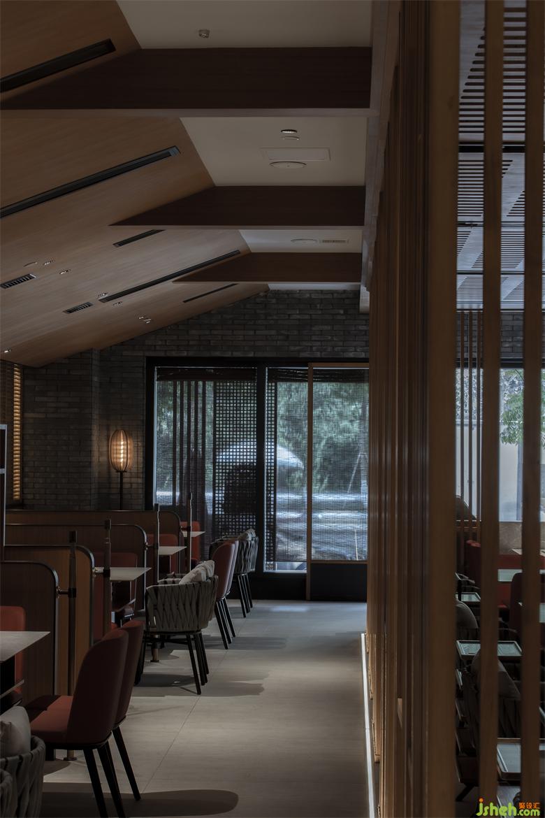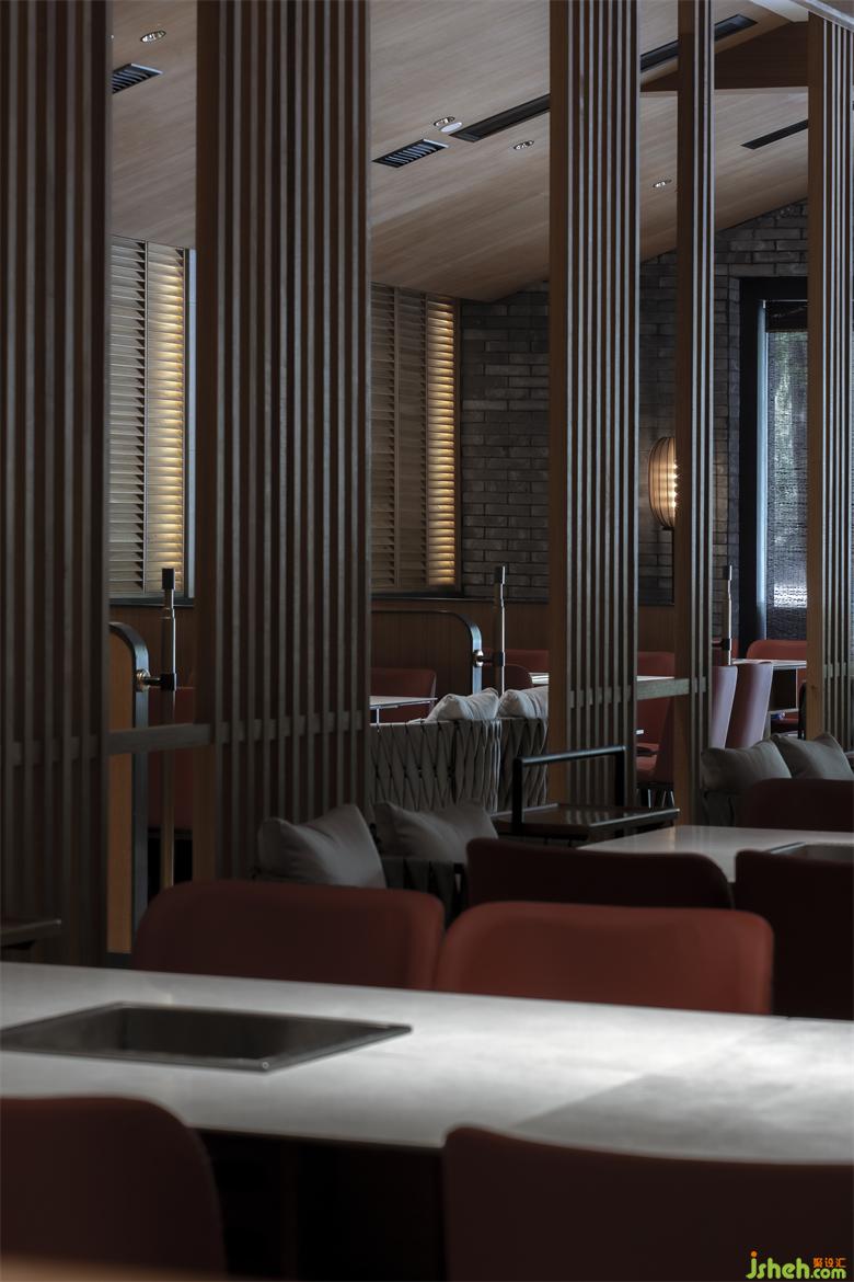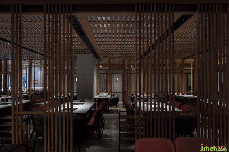 錦城印象成都餐廳設(shè)計高新店,是集嘉設(shè)計受委托進行品牌升級改造的第二家錦城印象門店。項目毗鄰高新區(qū)in99商業(yè)綜合體,是錦城印象品牌每日營業(yè)額冠軍門店,面積最小、上客率最高。在保證業(yè)態(tài)和高頻效翻臺率的同時,成都餐廳設(shè)計師利用園林景觀的設(shè)計邏輯--「空間越拆越小,空間越隔越大」,在大廳兩側(cè)設(shè)置了木柵隔斷,擴大空間視覺效果。