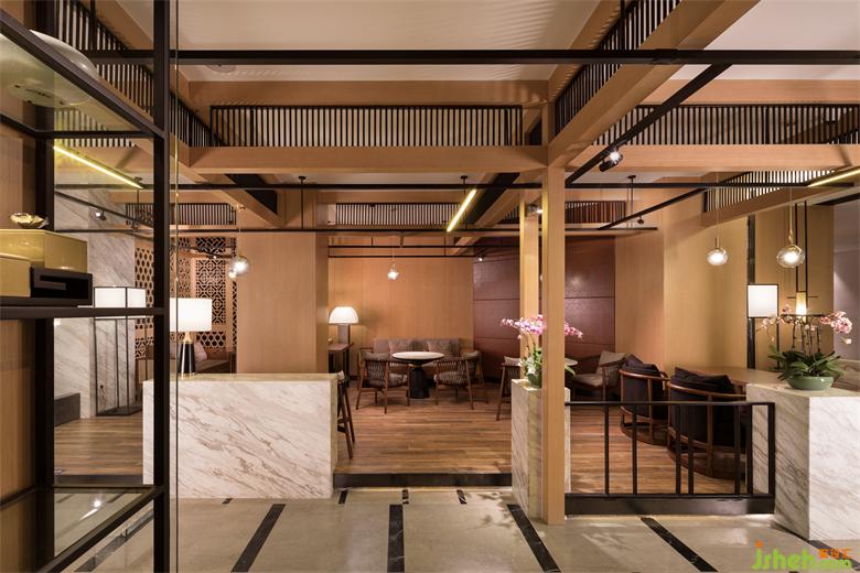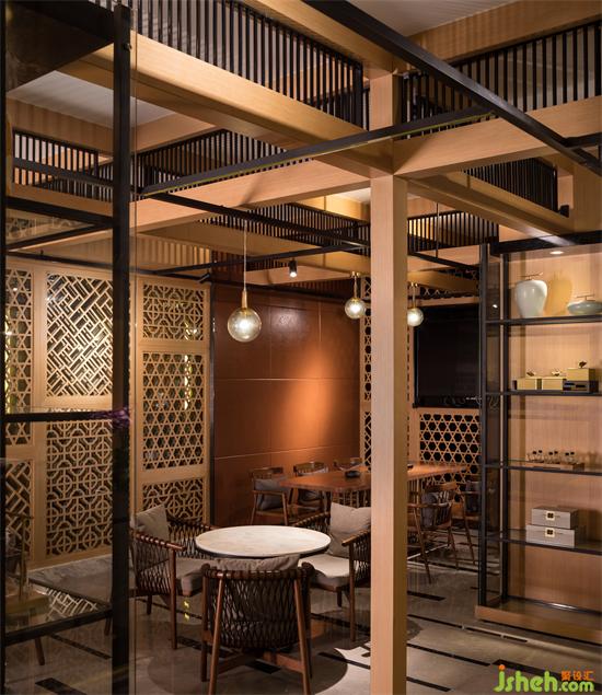 餐飲區(qū)分為大廳等候區(qū)和包間,大廳地面采用石材拼色,墻面木作窗花與皮革硬包,頂面木條與鋼條拼接。
