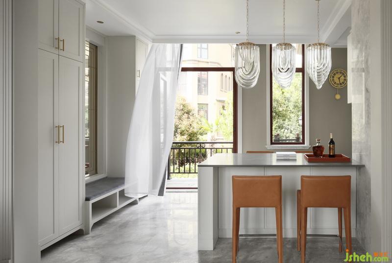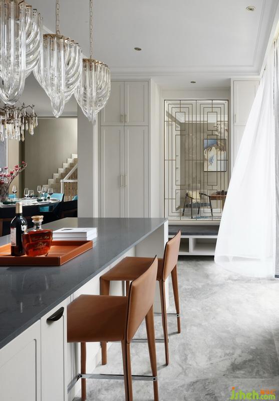 廚房跟餐廳間設(shè)有吧臺,家里常住人口有爸爸媽媽、爺爺奶奶還有兩個小朋友,晨起的時間,必然不固定,可以陸續(xù)隨意在此享用早餐。晚上爸爸歸來,也可以和爺爺在此小酌幾杯…