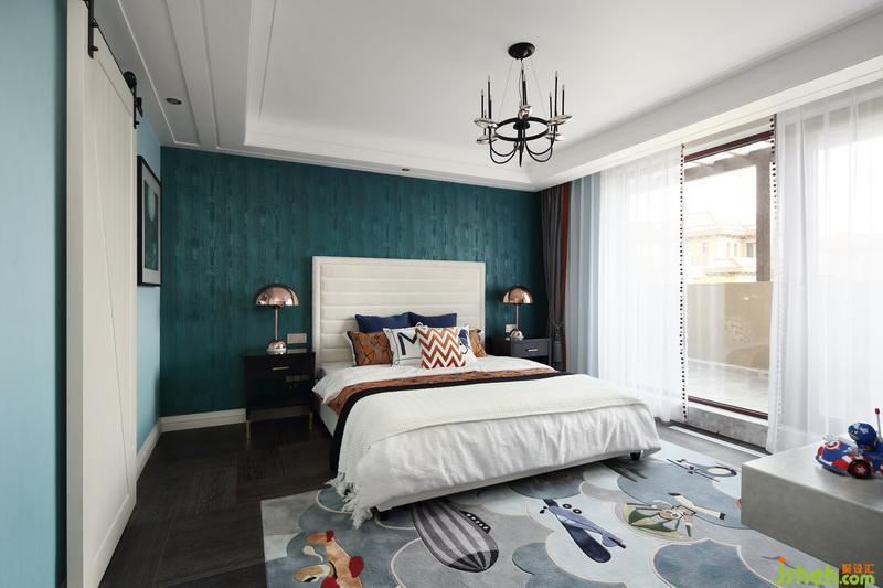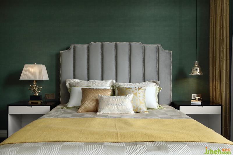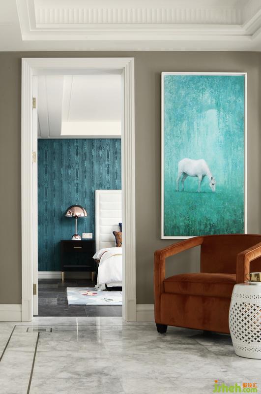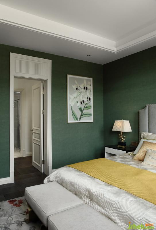清爽留白的裝飾畫點綴在綠色墻布上,輕松又兼具儀式感。床品及地毯的選擇也與之遙相呼應(yīng)…