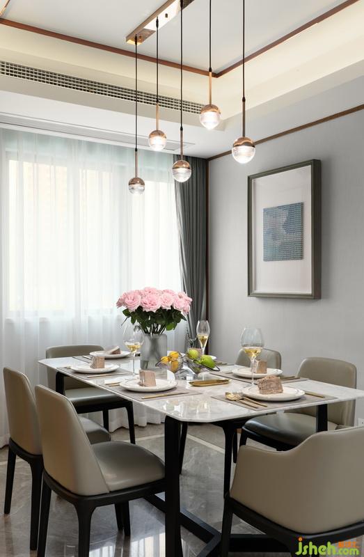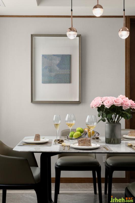 餐廳水晶燈選用了玫瑰金色,高低錯(cuò)落,一字排開,抽象的立體畫,精致而不失格調(diào),荔枝玫瑰的芬芳淡淡彌漫在空氣中,三兩好友,家人小聚,美好不過如此…