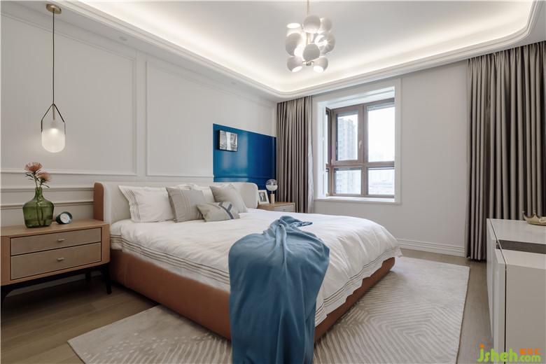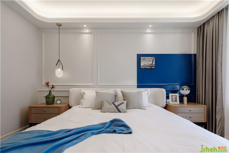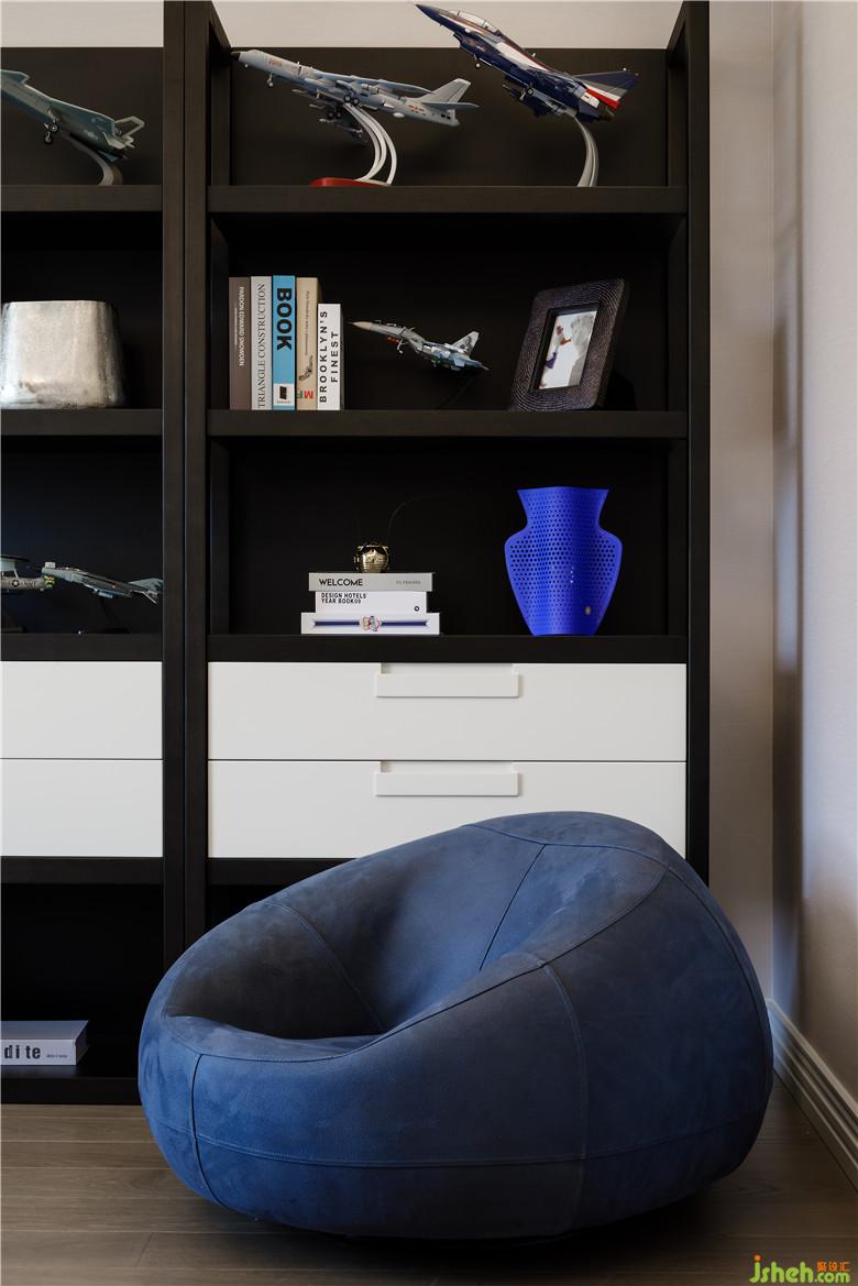 主臥背景,由簡單的線條方框而構(gòu)成,只需把握好比例,加入不一樣的藍色基調(diào),便能起到畫龍點睛的作用。原皮家具釋放出低調(diào)的溫暖,浸潤著這個空間…