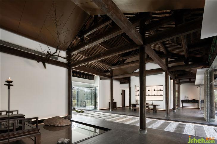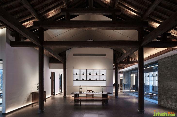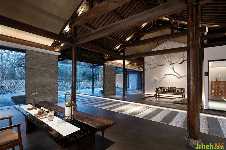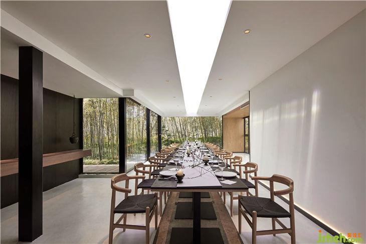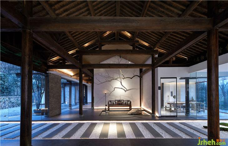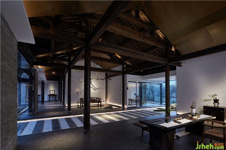 設(shè)計師在保護傳統(tǒng)柱梁結(jié)構(gòu)的基礎(chǔ)的上,為設(shè)計做了減法,采用了大落地玻璃,露出建筑本身的骨架,入口處的大玻璃盒子代表了一個無形的界限,既將四周景色與室內(nèi)空間相互打通,又增強了采光性與通透性。走入其中,有種虛實之間交錯之感,頗有佛法中“一切有為法,如夢幻泡影”的意味。