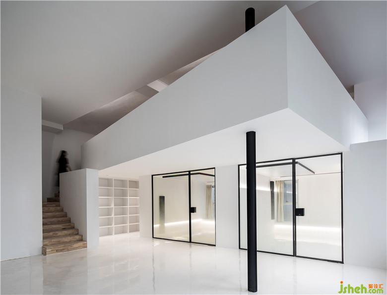 直播區(qū)的入口處,一根黑色柱子穿過塊面連接一層和二層閣樓,為空間做了很好的延伸。