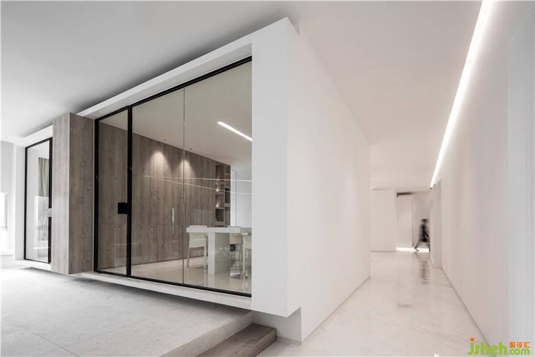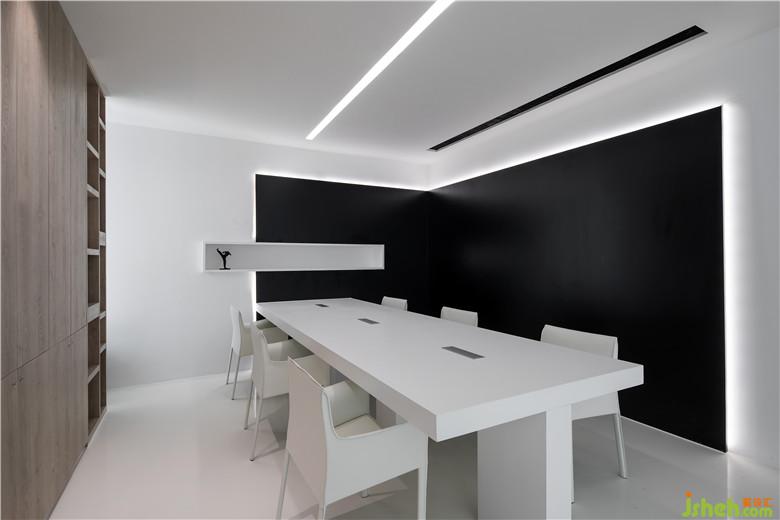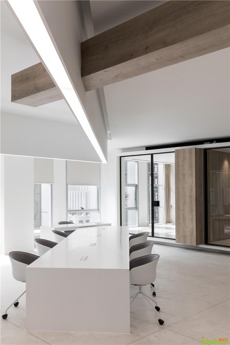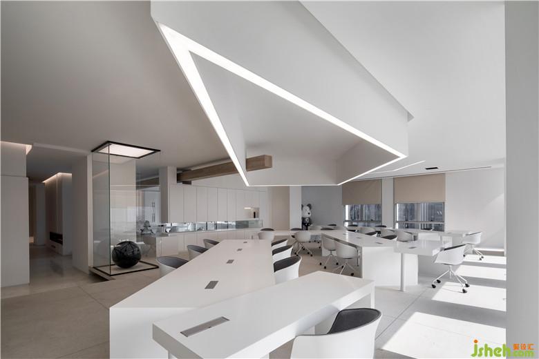 員工辦公區(qū)大面積采用了白色,線型的暖光燈為空間加強(qiáng)了結(jié)構(gòu)性,顯得更加自由。辦公桌沿著頂部燈的走向分布,呈現(xiàn)出有秩序的美感。
