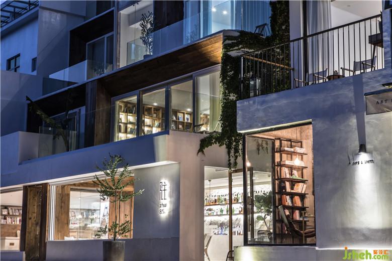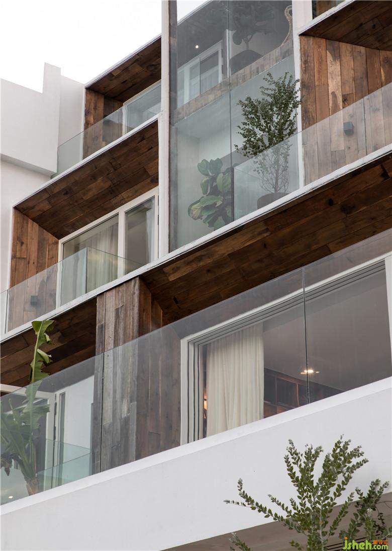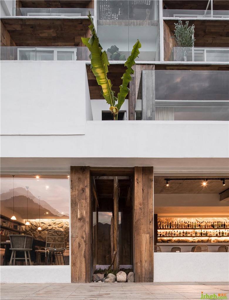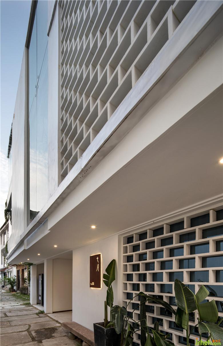 「駐·85」的建筑通體呈白色,結(jié)合江南傳統(tǒng)的“白墻黑瓦”的傳統(tǒng)進(jìn)行創(chuàng)新,融合在當(dāng)?shù)亟ㄖ褐?。設(shè)計(jì)師用一個(gè)個(gè)“木方塊”堆疊,讓建筑外立面變得擁有構(gòu)成感,并且做了層層內(nèi)退的處理,使用了木飾面與通透的玻璃材料為原本封閉的空間劃出了陽臺(tái),為空間擴(kuò)大了視野、加強(qiáng)層次感。