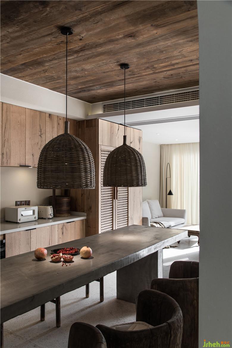 一層的公共區(qū)域劃分為廚房、閱讀區(qū)、以及沙發(fā)休息區(qū),空間整體色調(diào)充滿自然的樸素感,設(shè)計(jì)師希望來到這里能夠讓人們停下腳步,感受自然的氣息。