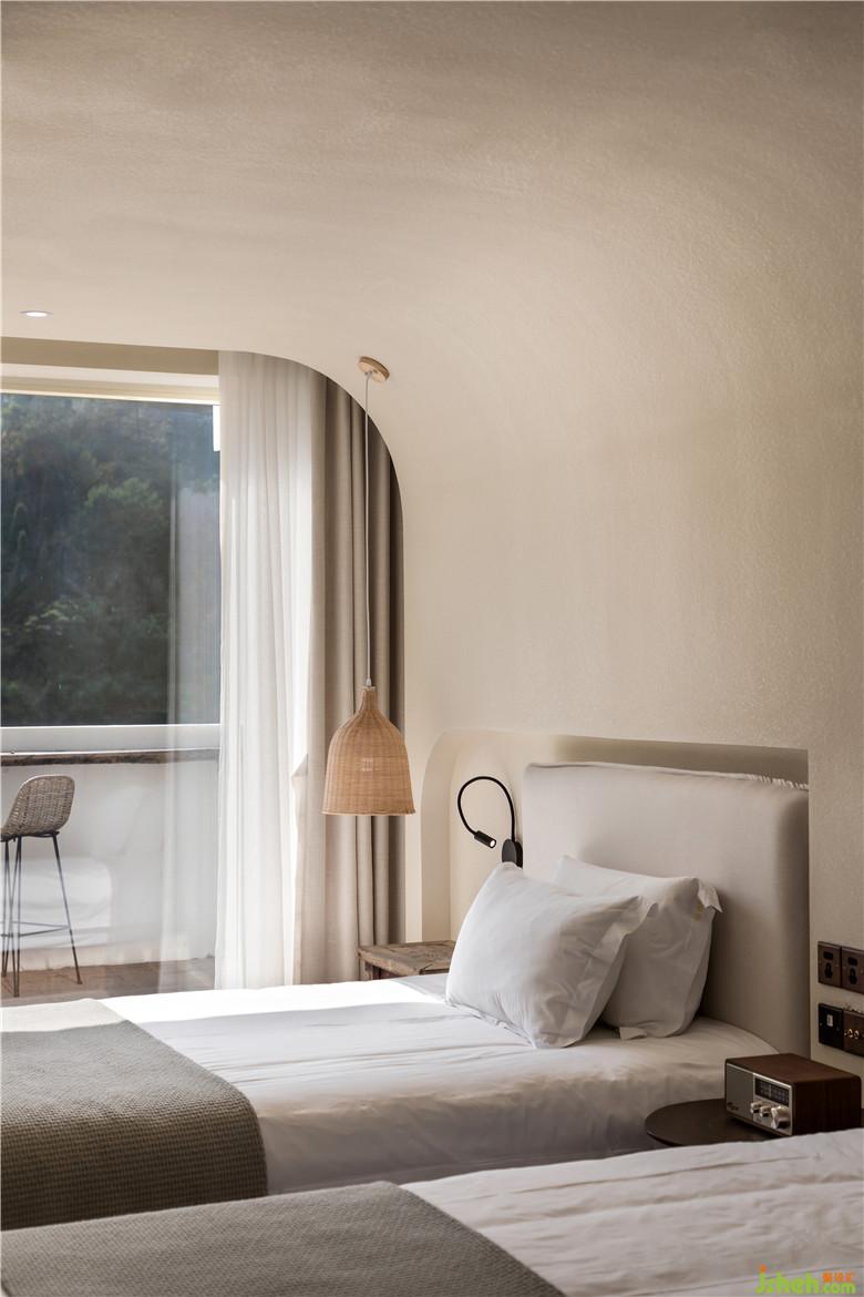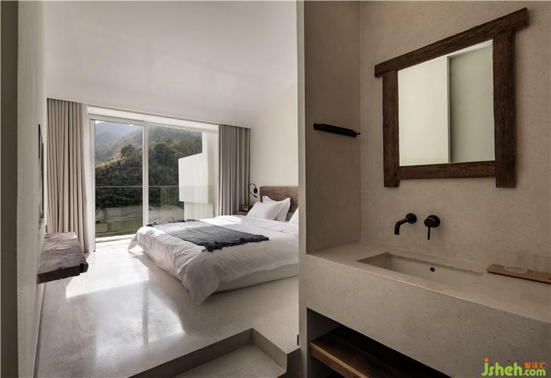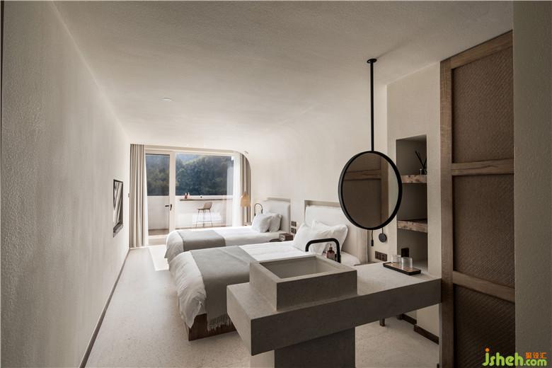 酒店設(shè)計每間房型都是“開窗臨水便迎山”,拉開窗簾便可放入滿滿一室的青山綠水。臥室內(nèi)有著書桌和沙發(fā),可以在這里寫下一天的感悟,記錄此刻所想。