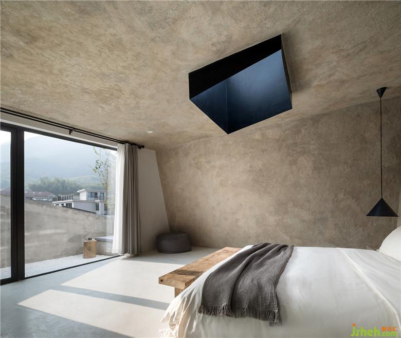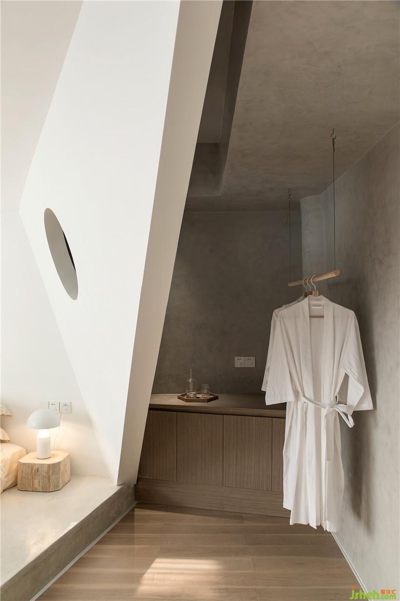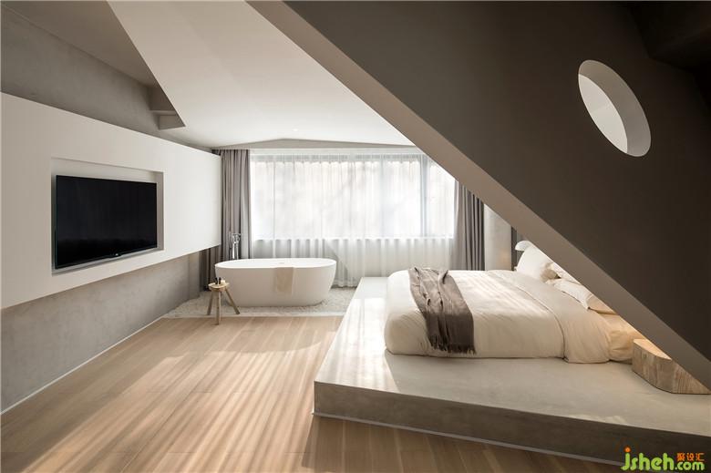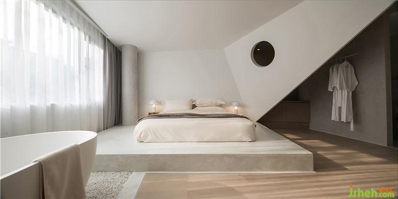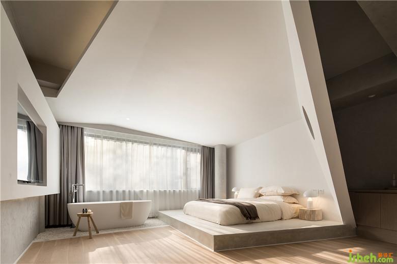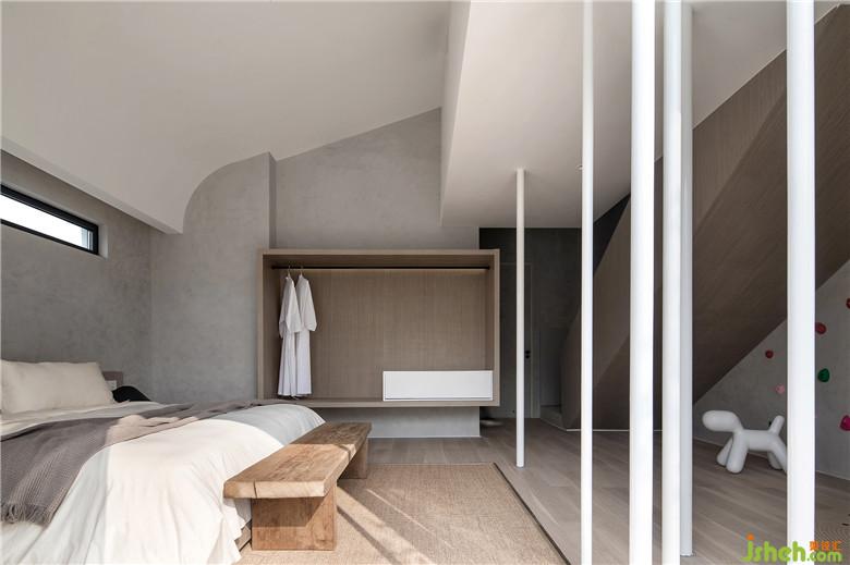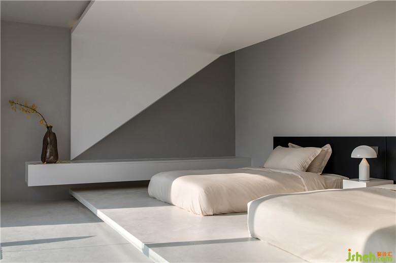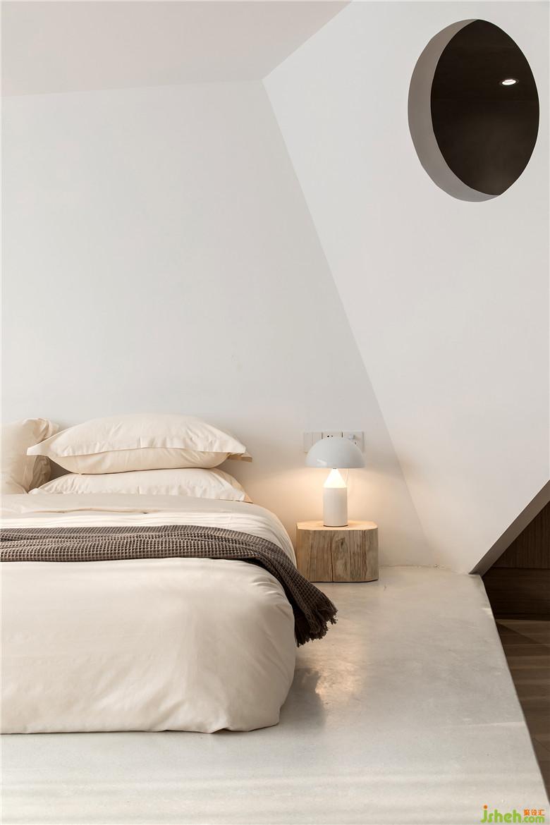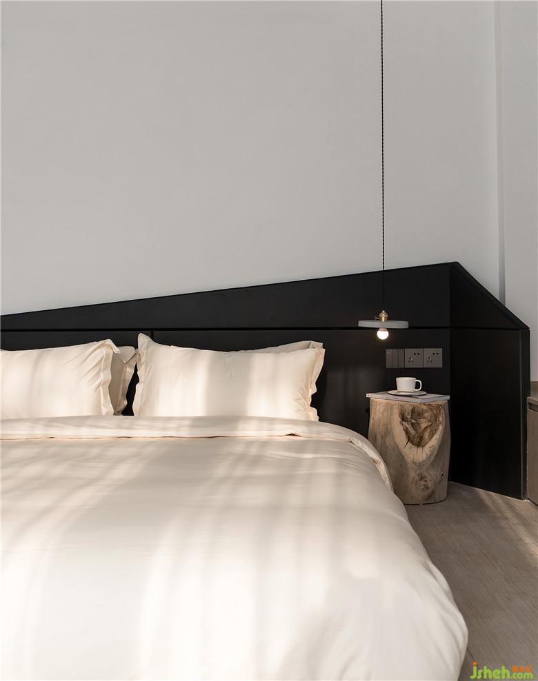 床邊的鳥(niǎo)翼造型墻體將空間的功能區(qū)劃分開(kāi)來(lái),延伸了空間感。