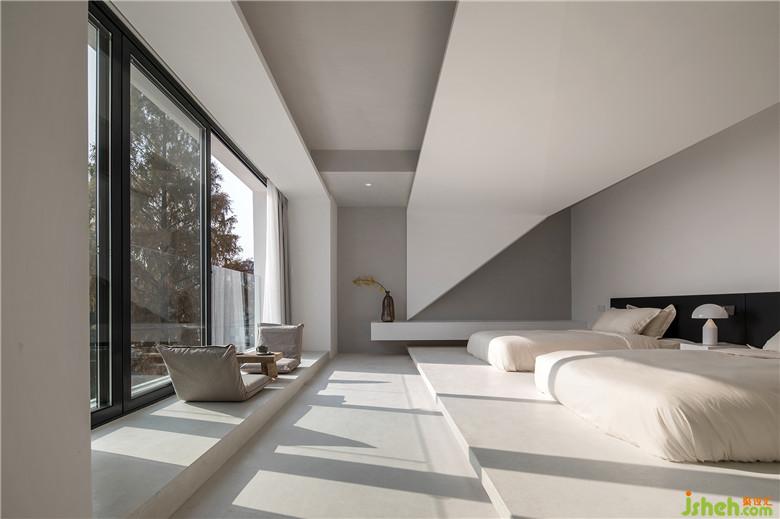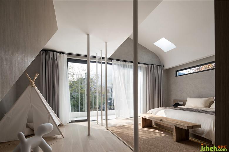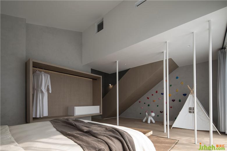 設(shè)計(jì)師將親子房設(shè)計(jì)成了一片“白色森林”,當(dāng)陽(yáng)光照射進(jìn)時(shí),一道道光影展現(xiàn)出來(lái),墻面上的攀爬墻以及地上的小帳篷為孩子增加了玩樂(lè)的體驗(yàn),充滿著童趣。