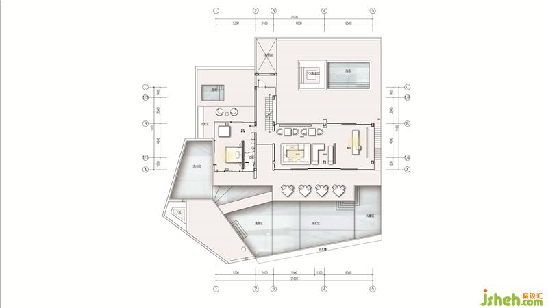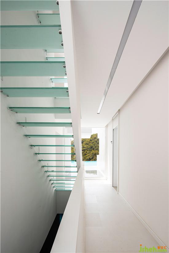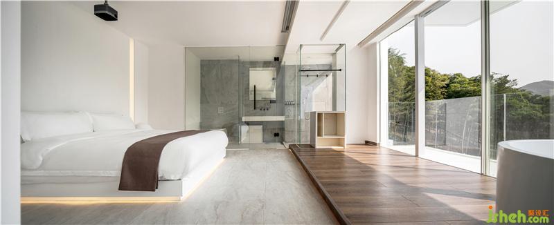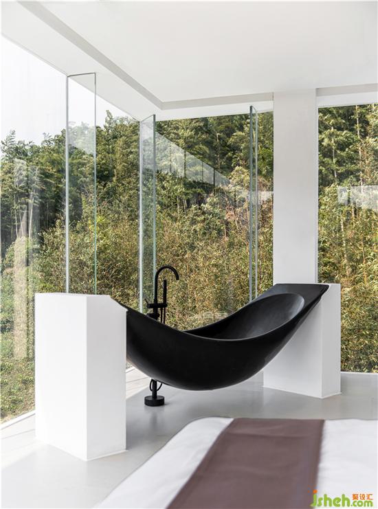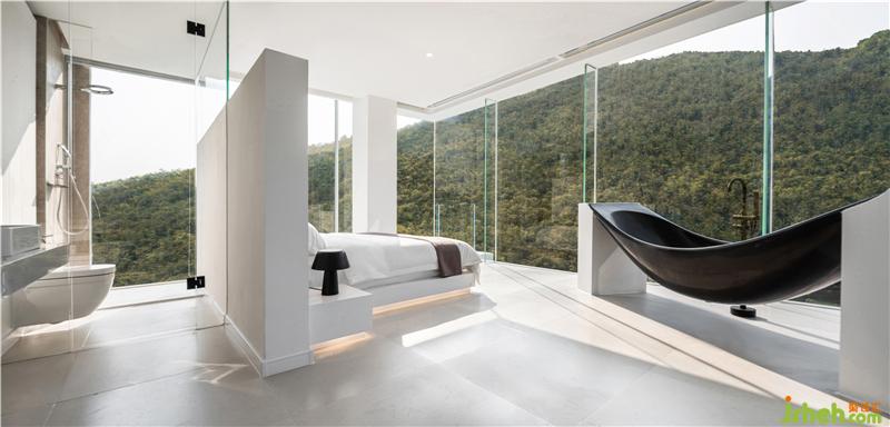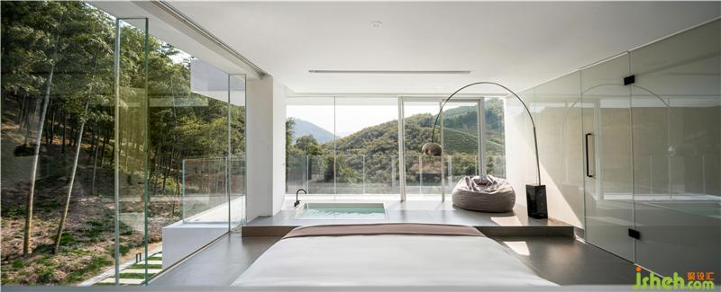 Guest room in the design will do the pillar back processing, and corner glass to the title, so that the natural reflection into each corner of the room. The bed and bath crock are apart from the window only one step, pulled closer the distance between the person and nature more.